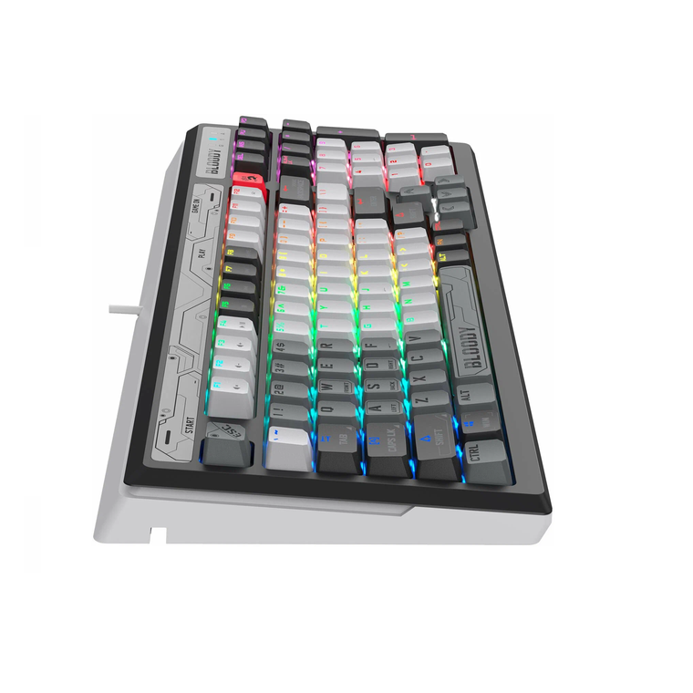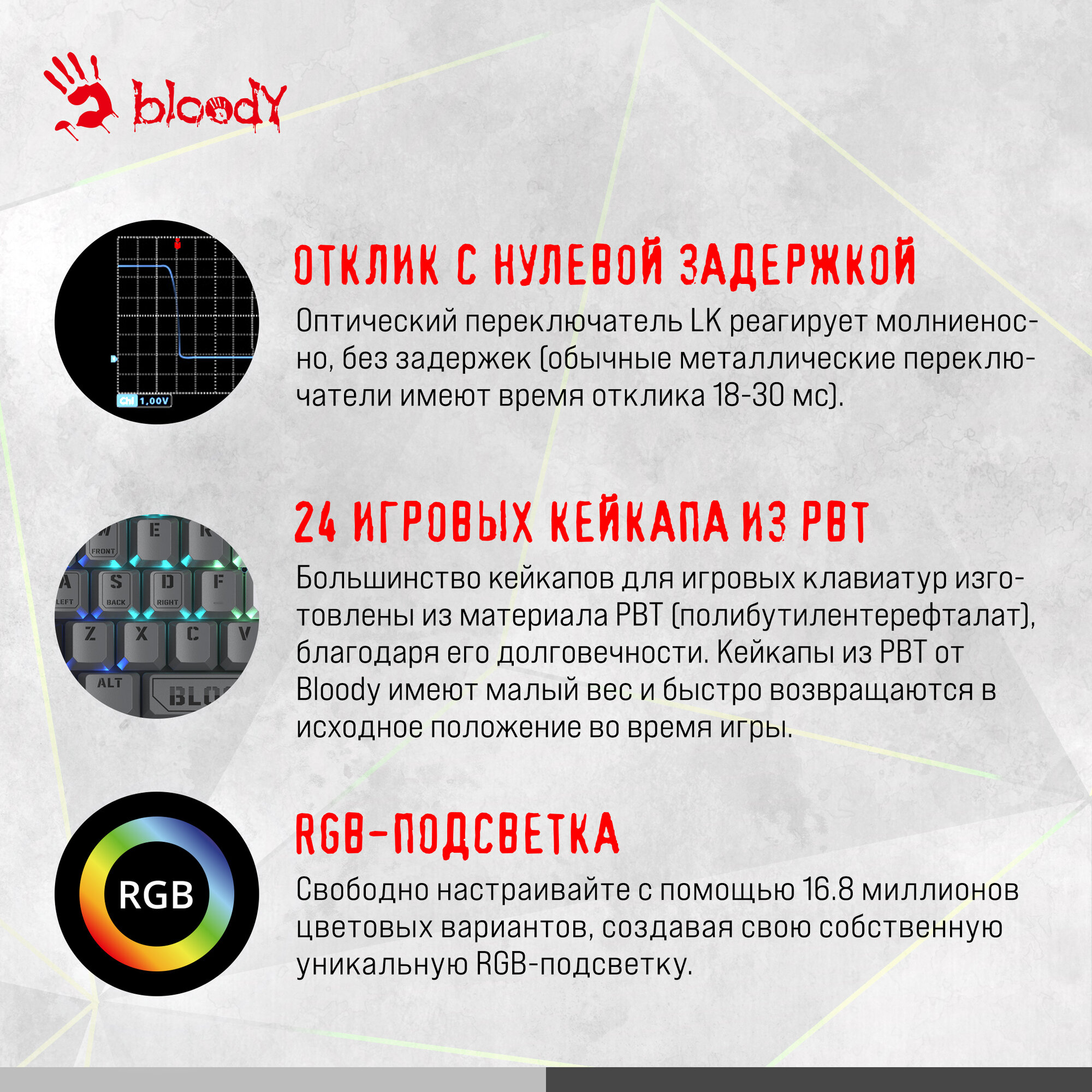 Большинство кейкапов для игровых клавиатур изготовлены из материала PBT (полибутилентерефталат), благодаря его долговечности. Кейкапы из PBT от Bloody имеют малый вес и быстро возвращаются в исходное положение во время игры.