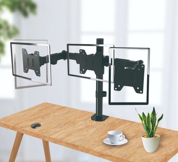 Кронштейн для монитора Wize надежно крепится к краю столешницы посредством стандартной струбцины. В конструкции предусмотрены держатели для одновременной фиксации трех экранов диагональю 14-32 дюймов. Изделие рассчитано для общей нагрузки до 10 кг. Благодаря наличию поворотного основания положение каждого монитора можно настраивать индивидуально. Это позволяет создать комфортные условия для работы, игр, просмотра контента, ведения трансляций.