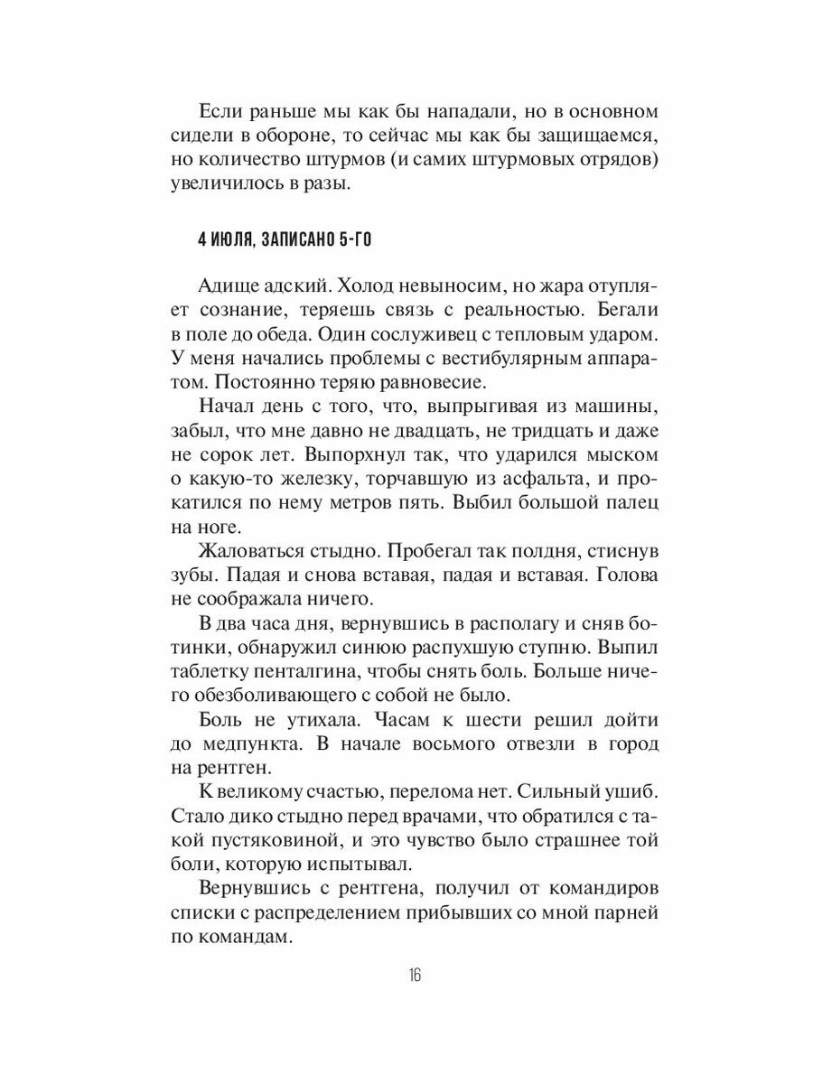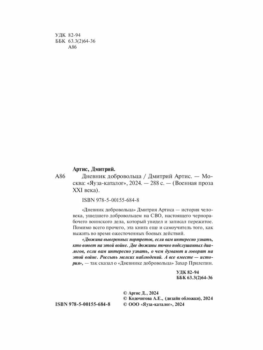 "Дневник добровольца" Дмитрия Артиса - история человека, ушедшего добровольцем на СВО, настоящего чернорабочего воинского дела, который увидел и записал пережитое. Помимо всего прочего, эта книга еще и самоучитель того, как выжить во время ожесточенных боевых действий. "Дюжина выверенных портретов, если вам интересно узнать, кто воюет на этой войне. Две дюжины точно подслушанных диалогов, если вам интересно узнать, о чем думают и говорят на этой войне. Россыпь мелких наблюдений. А все вместе - история", - так сказал о "Дневнике добровольца" Захар Прилепин.