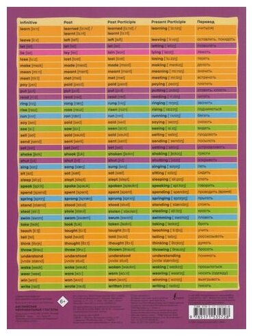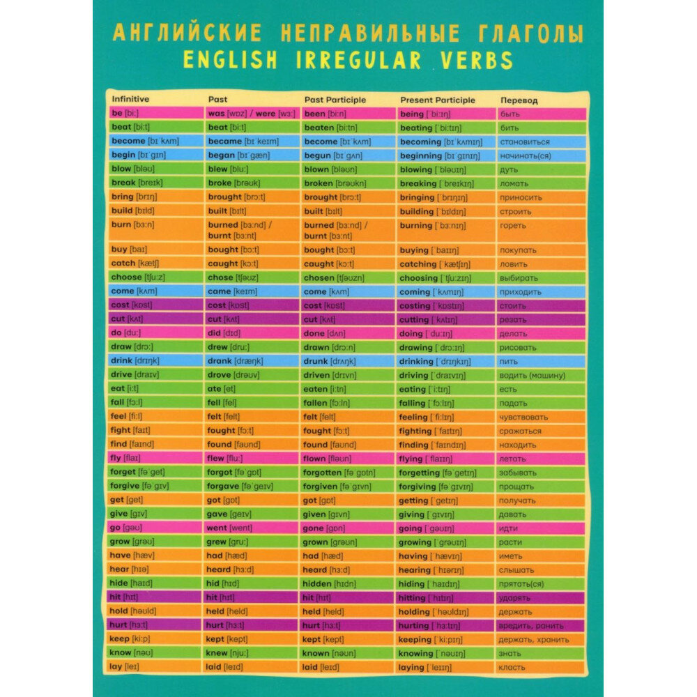 Плакат-подсказка "Английские неправильные глаголы" – незаменимый помощник в изучении английского языка. В таблице представлены 80 самых употребительных неправильных глаголов. К каждому глаголу даются три формы, а также ing-форма и перевод. Все формы глаголов снабжены международной фонетической транскрипцией. Глаголы с похожим способом образования форм выделены одинаковыми цветами.