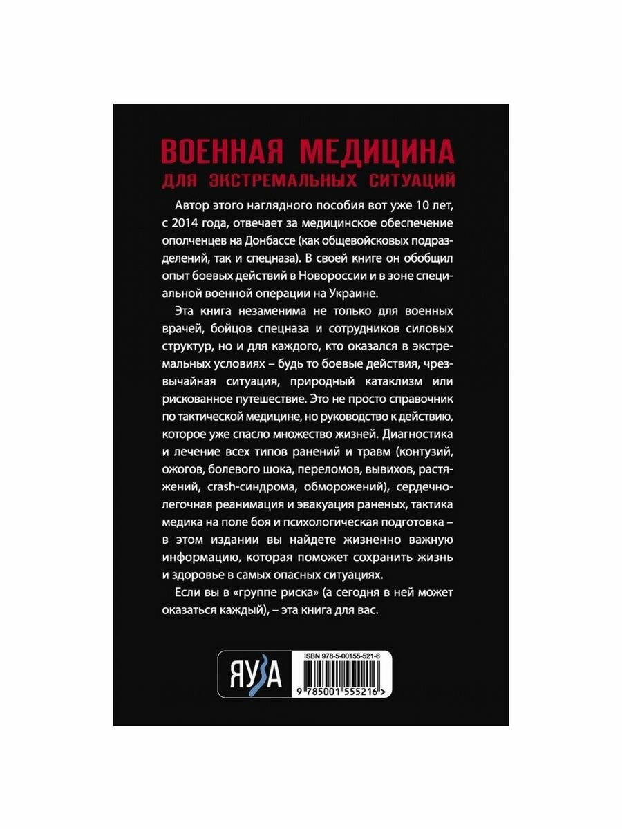 Автор этого наглядного пособия вот уже 10 лет, с 2014 года, отвечает за медицинское обеспечение ополченцев на Донбассе (как общевойсковых подразделений, так и спецназа). В своей книге он обобщил опыт боевых действий в Новороссии и в зоне специальной военной операции на Украине.