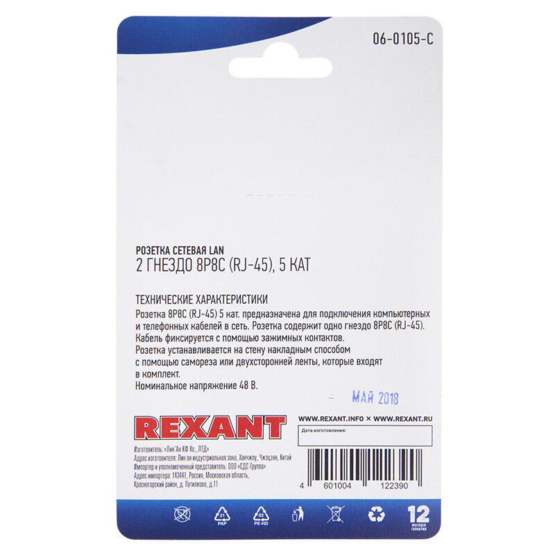 Розетка Rexant сетевая LAN на стену (2 гнездо 8Р8С (Rj-45) 5e кат) (10шт) 06-0105-C