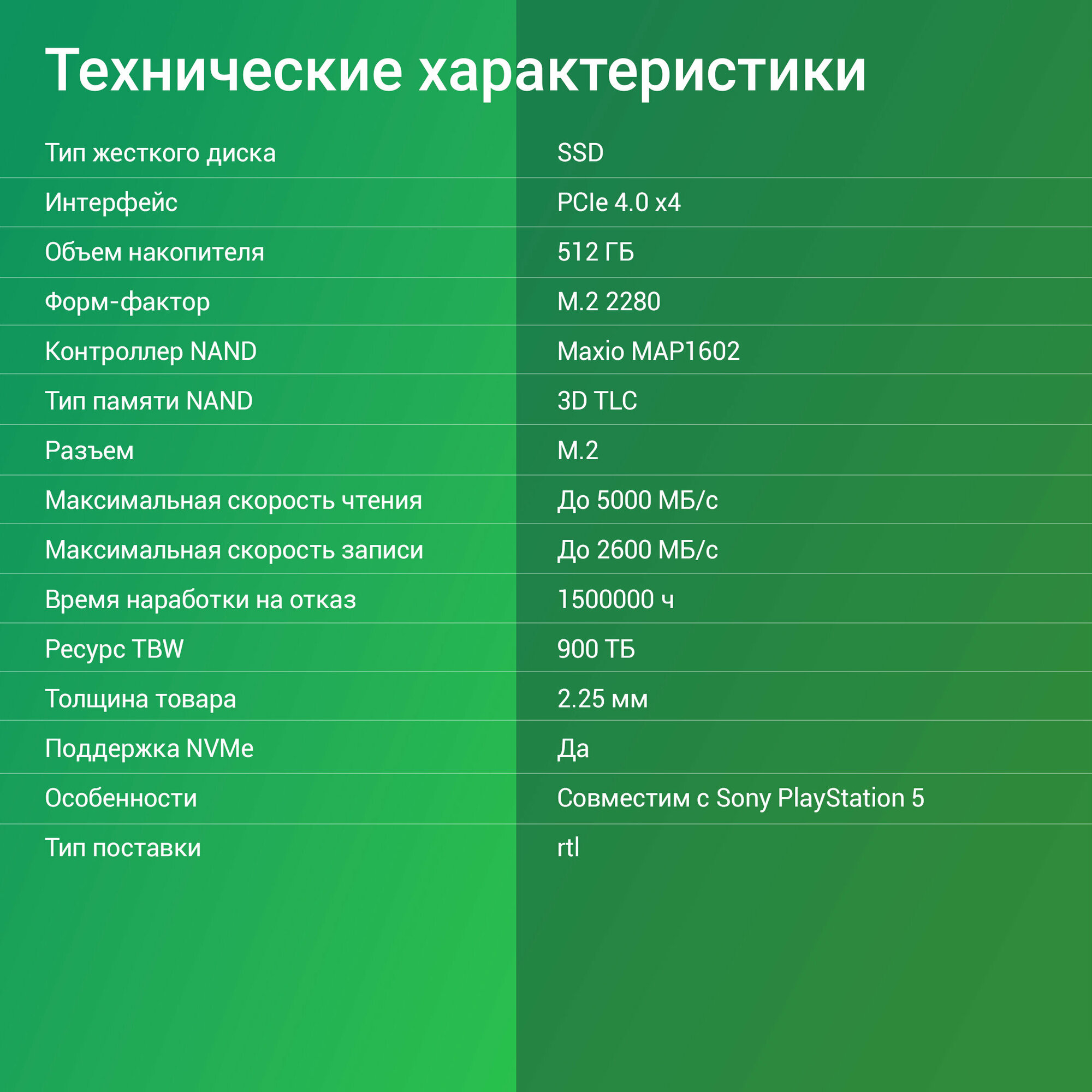 | Объем | 512 ГБ; интерфейс:PCIe 4.0 x4 |