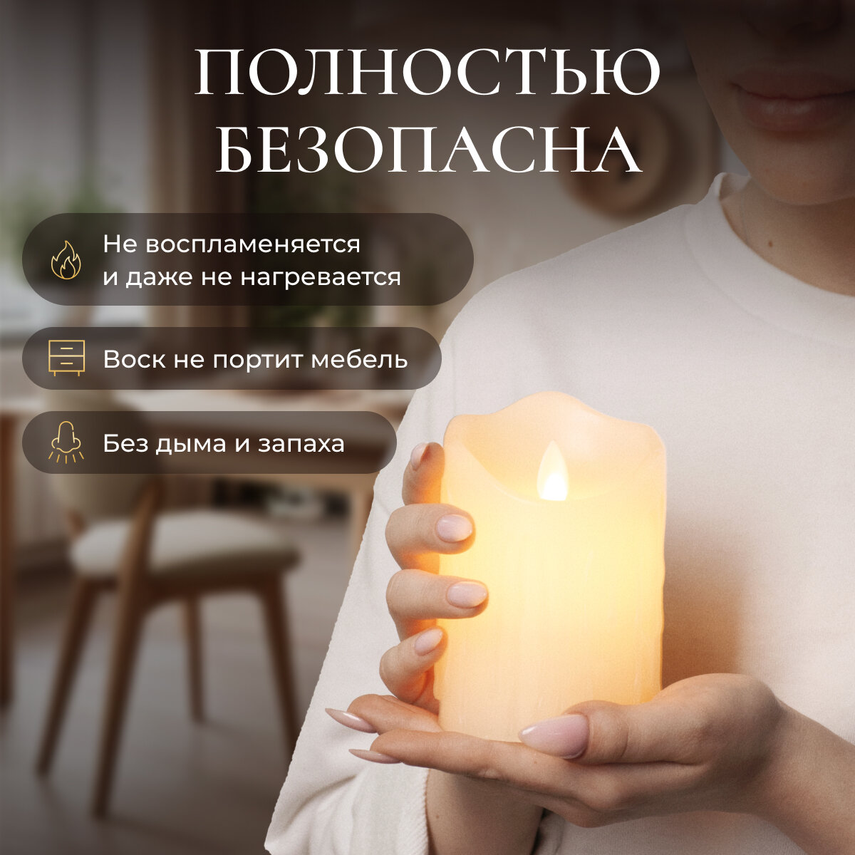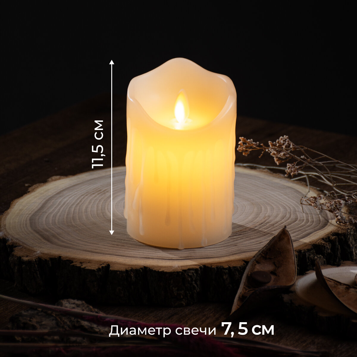 Благодаря встроенному ИК-датчику, совместимо с системой умный дом. Светодиодная восковая свеча, с имитацией живого пламени. Диммер, таймер на 2, 4, 6, 8 часов. Постоянное свечение, мерцание. Работает от пульта ДУ. Пульт работает от батареек типа CR2025 (в комплекте). Свечи работают от батареек типа ААА - 3 шт., в комплект не входят.