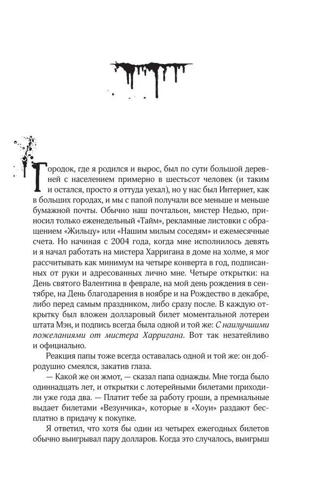 Стивен Кинг — писатель, любящий традиции. И одна из самых прекрасных и почитаемых миллионами его фанатов традиций — это публикация сборников, неизменно состоящих из четырех повестей. Так, мы все хорошо знакомы с книгами "Четыре сезона", "Четыре после полуночи", "Тьма, — и больше ничего".И на сей раз Стивен Кинг представляет читателям именно такой сборник, где каждое произведение погружает нас в свою неповторимую и загадочную атмосферу.В заглавной повести "Будет кровь" полюбившаяся многим героиня "Чужака" и трилогии "Мистер Мерседес" Холли Гибни после ужасного взрыва в школе понимает, что в мире существуют и другие монстры, подобные чужаку, но на этот раз ей предстоит встретиться со Злом один на один."Телефон мистера Харригана" — трогательная история дружбы мальчика и пожилого миллионера.В повести "Жизнь Чака" Мастер размышляет о значимости человеческой жизни.Финальная новелла "Крыса" повествует о сделке, заключенной между писателем и весьма необычным существом.