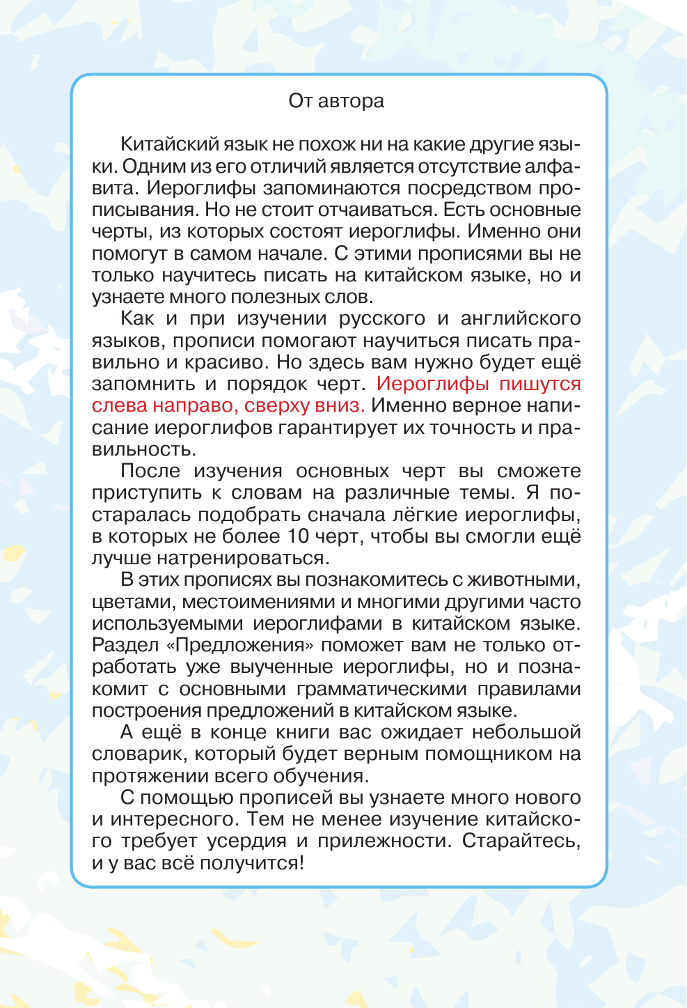 Данное пособие способствует формированию навыков письма на китайском языке у младших школьников. С помощью этих прописей дети научатся писать правильно и аккуратно, запомнят порядок черт написания иероглифов, выучат новые слова и выражения.Издание имеет удобный формат и содержит красочные иллюстрации, что поможет заинтересовать и увлечь ребёнка. Пособие предназначено для учеников начальной школы, учителей и родителей. Это издание можно использовать как на уроках, так и для дополнительных занятий.Дайте вашему ребенку возможность познакомиться с одной из самых древних письменностей мира и открыть для себя красоту и мудрость китайского языка!