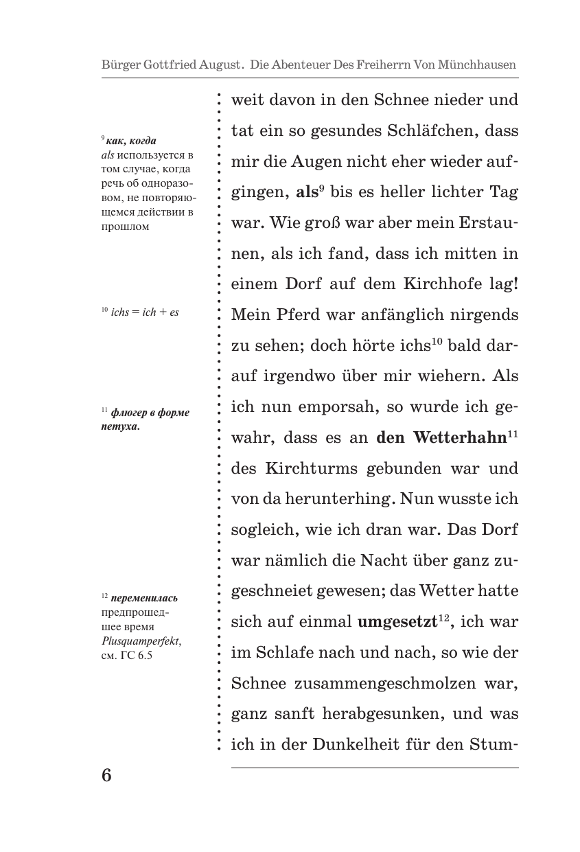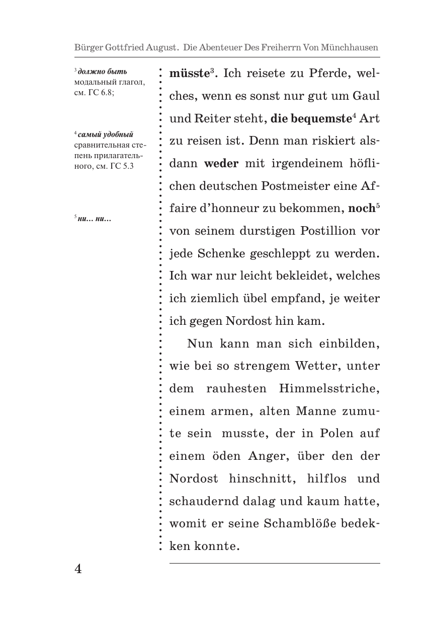 Лучший способ учить иностранный язык – это читать художественное произведение, постепенно овладевая лексикой и грамматикой. Совершенствуйте свой немецкий язык, окунувшись в водоворот невероятных приключений легендарного барона Мюнхгаузена! В этой поразительной и абсолютно правдивой библиографии вы узнаете историю человека, который успел побывать в местах, о существовании которых не подозревают даже именитые географы. Забудьте о скучной логике и привычной реальности, ведь здесь вы встретитесь с лунными жителями, прокатитесь на потоке лавы, не обжигая ботинки, и даже полетаете на ядре! «Приключения барона Мюнхгаузена» – это не просто книга, это энциклопедия удивительного, которая поможет вам увеличить свой словарный запас и научиться использовать грамматические конструкции в контексте. Полный текст произведения снабжён подробным лексико-грамматическим комментарием с отсылками на правила в Грамматическом справочнике. В конце книги помещён немецко-русский словарь, включающий лексику романа. Учите немецкий язык с удовольствием!