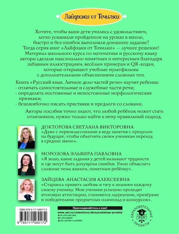 Хотите, чтобы ваши дети учились с удовольствием, легко усваивали пройденное на уроках в школе, быстро и без ошибок выполняли домашнее задание? Тогда серия книг «Лайфхаки от Точилки» — лучшее решение! Материал школьного курса по математике и русскому языку авторы сделали максимально понятным и интересным благодаря забавным иллюстрациям, весёлым примерам и QR-кодам, которые открывают учебные мультфильмы с дополнительными объяснениями сложных тем. Книга «Русский язык. Личное дело частей речи» научит ребенка: . отличать самостоятельные и служебные части речи; . определять постоянные и непостоянные морфологические признаки; . безошибочно писать приставки и предлоги со словами. Авторы пособия точно знают, что любой ребёнок может стать отличником, нужно только найти к нему правильный подход.