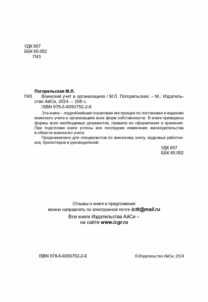 Воинский учет в организациях. Пошаговая инструкция. Формы документов и правила оформления (Погорельская Марина Лероновна); АйСи Групп, 2024