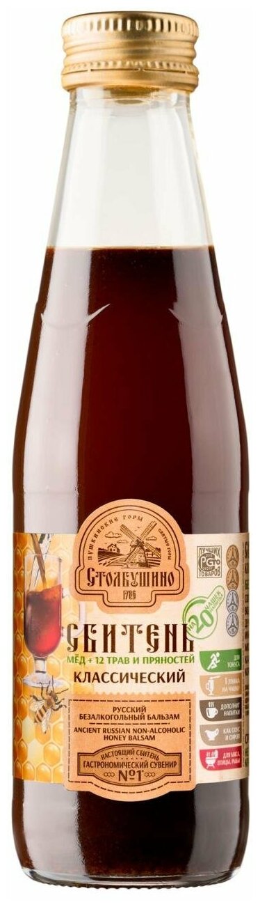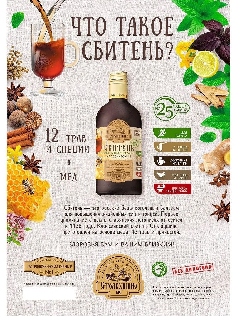 Сбитень Столбушинский классический 250 мл - это уникальный сироп, который представляет собой идеальное сочетание великолепного вкуса и полезных свойств. Он станет отличным выбором для всех любителей кофе, напитков и чая.