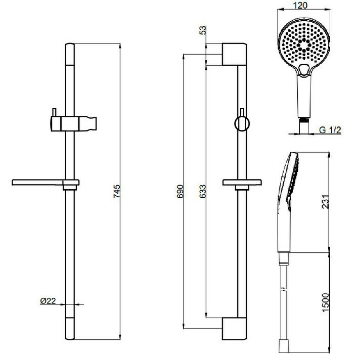 - Держатель ручного душа регулируемый по высоте, поворотный.