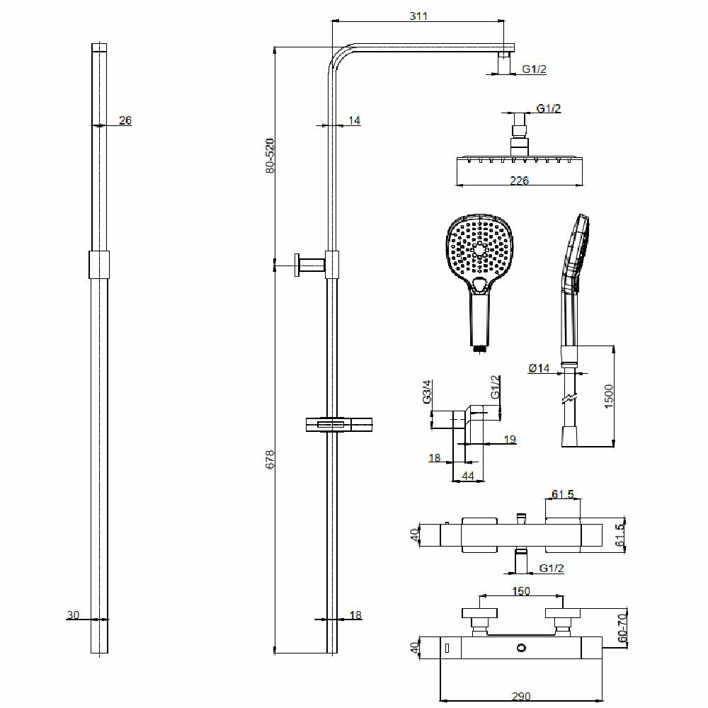 - Размер верхнего душа (ШхД): 226х226 мм.