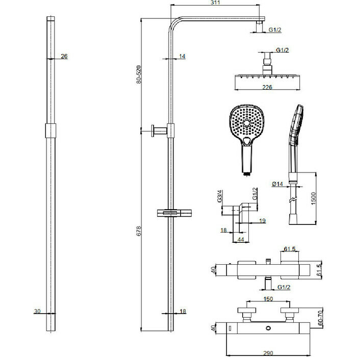 - Размер верхнего душа (ШхД): 226х226 мм.