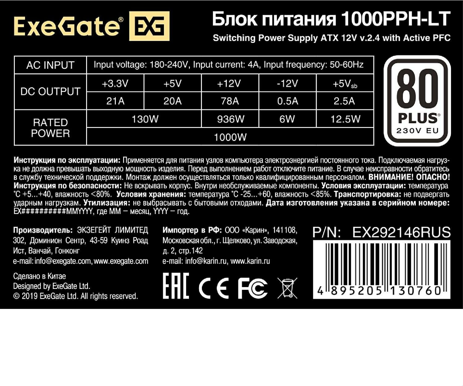 Блок питания ATX Exegate 1000W APFC 80 PLUS 120mm fan кабель 220V с защитой от выдергивания EX292146RUS-S