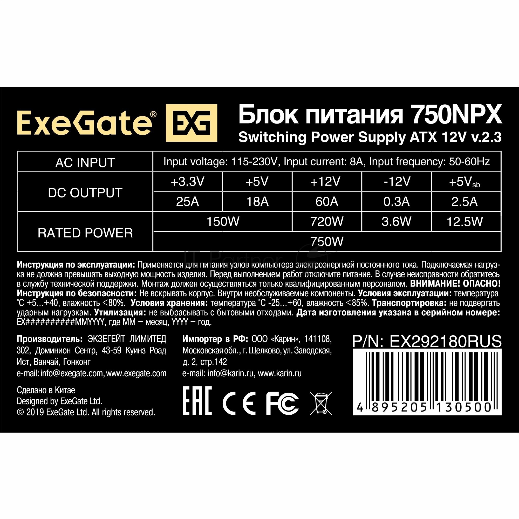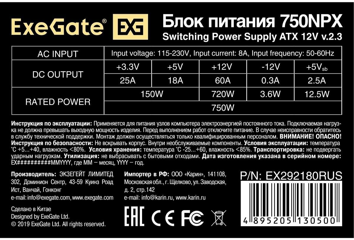 Блок питания ATX Exegate 750W 120mm fan кабель 220V с защитой от выдергивания EX292180RUS-S