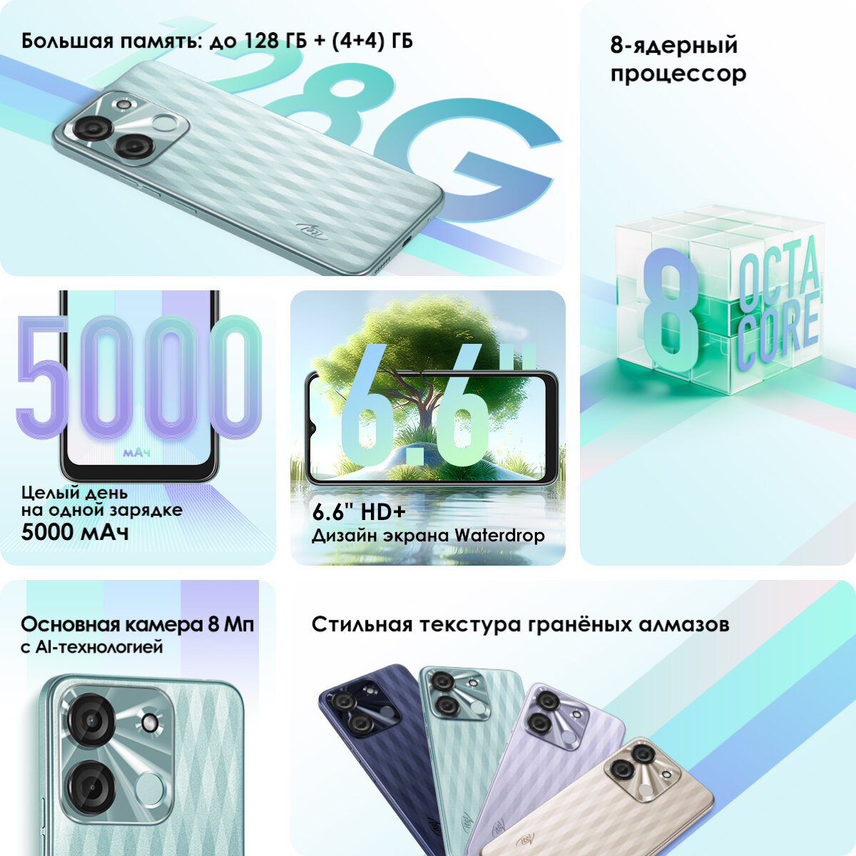 Смартфон ITEL 66" IPS 1612x720 SC9863A Octa core 8 x 16 ГГц 4 GB RAM 128GB ROM 2 SIM 8+0.08 Мп 4G (LTE) 5000 мАч A60s A662LM 128+4 green