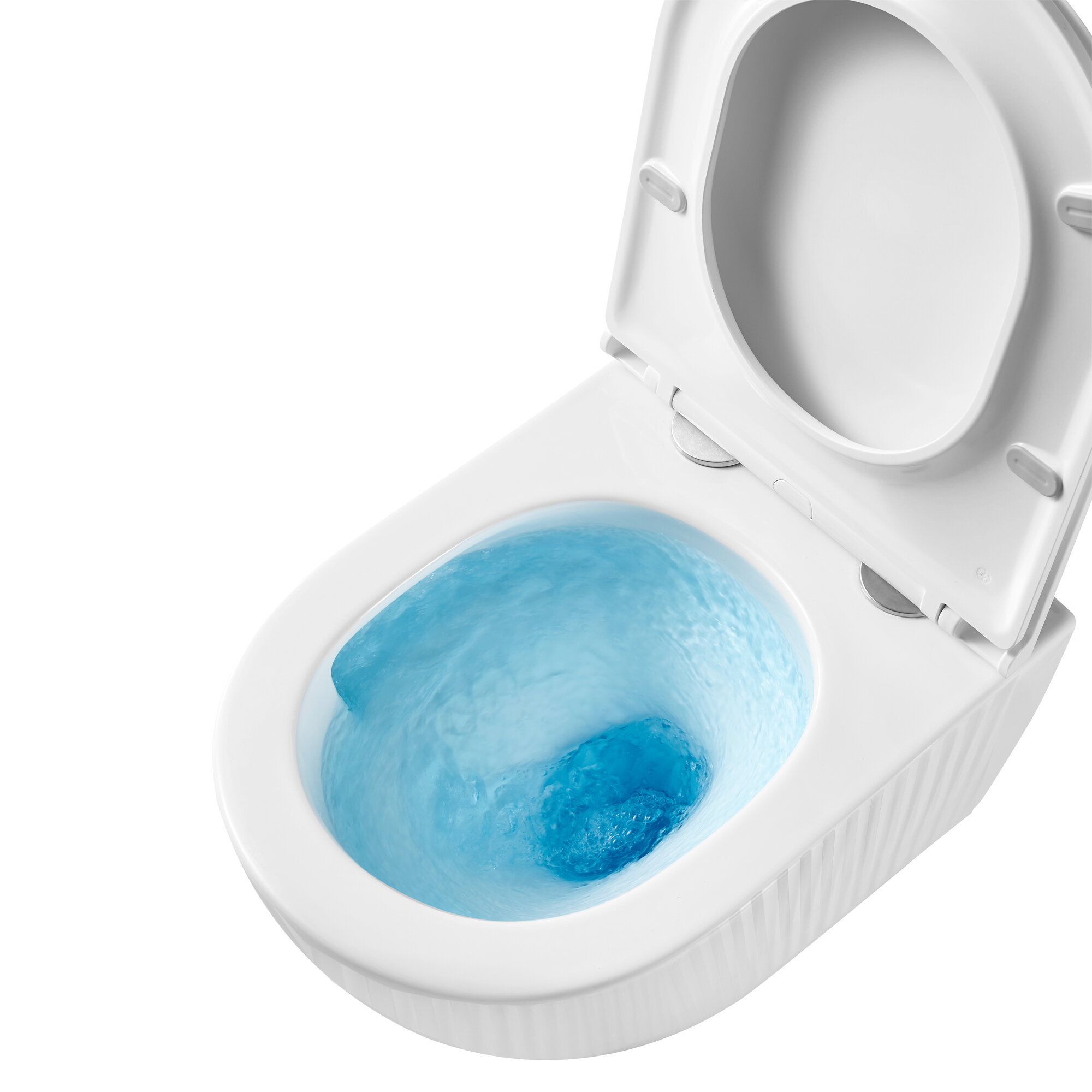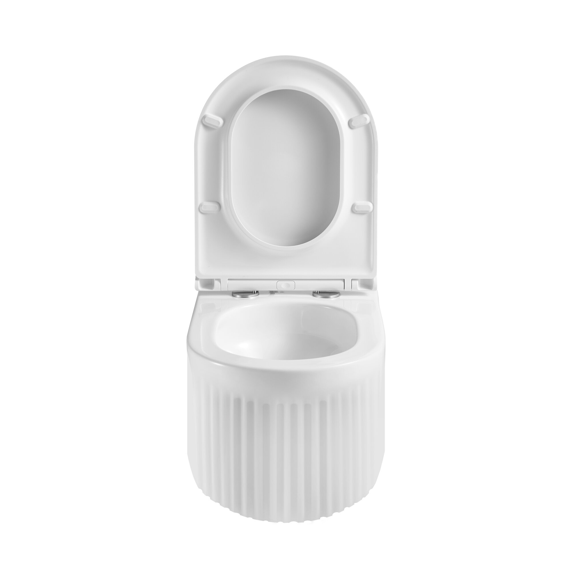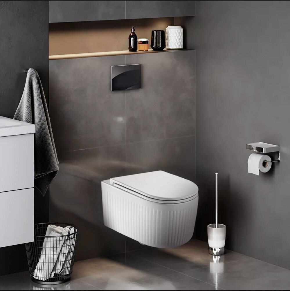 Безободковый, подвесной унитаз с ультратонким, антибактериальным сиденьем с плавным закрыванием и легкосъемным механизмом, петли хром.