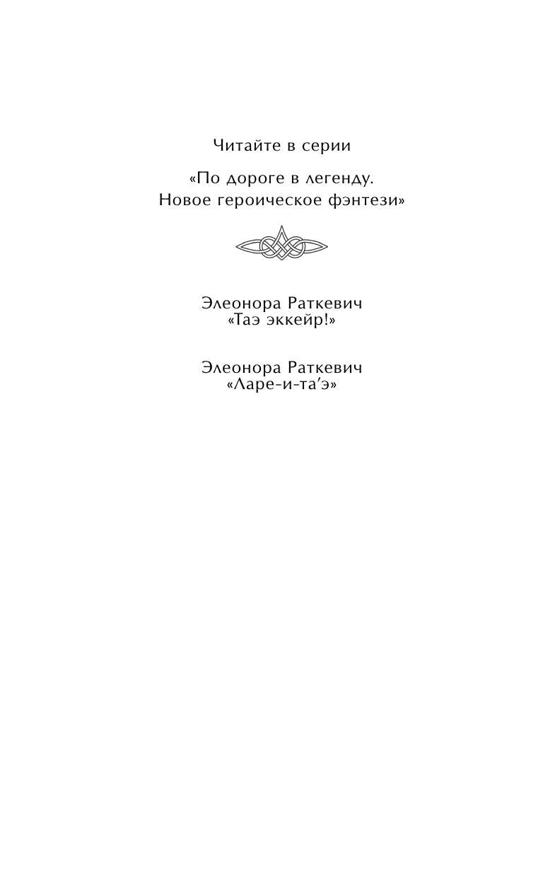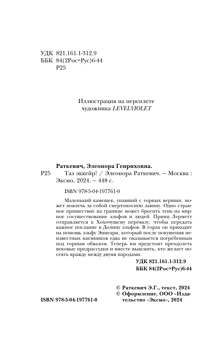 Маленький камешек, упавший с горных вершин, может повлечь за собой смертоносную лавину. Одно странное происшествие на границе может бросить тень на мирное сосуществование эльфов и людей. Принц Лерметт отправляется к Хохочущему перевалу, чтобы передать важное послание в Долину эльфов. В горах он приходит на помощь эльфу Эннеари, который после покушения неизвестных наемников едва не оказывается погребенным под горным обвалом. Теперь им предстоит преодолеть вековые предрассудки и вместе выяснить, кто желает посеять вражду между двумя народами. "Обосновывать любовь логически всегда трудно, а "Таэ эккейр! " мне очень дорога. Я люблю эту книгу за светлую мудрость, сразу и с лукавинкой и грустинкой. А как же иначе, ведь речь идет о рождении, казалось бы, невозможной дружбы, и дружбе этой предстоит раз за разом спасать не только будущих друзей и не только от смерти. "Таэ эккейр" - это по-эльфийски "Ты не умрешь! "" - Вера Камша, автор цикла романов "Отблески Этерны" Книга от известной писательницы Элеоноры Раткевич, чьи романы "Деревянный меч", "Наемник мертвых богов" и "Парадоксы Младшего Патриарха" стали классикой русского фэнтези. Захватывающая история о дружбе, неизбежных потерях и бессмертии, которое может обернуться тяжелым грузом. О том, как важно слушать других и быть услышанным в ответ. И надежде, которая не покидает нас даже в самые темные времена. Красивое переиздание для фанатов с картой и обложкой от известного художника Levelviolet!