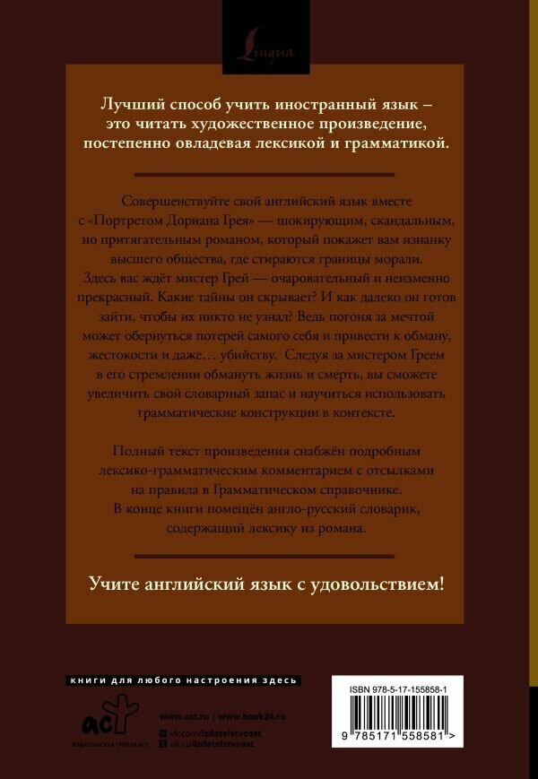 Совершенствуйте свой английский язык вместе с "Портретом Дориана Грея" – шокирующим, скандальным, но притягательным романом, который покажет вам изнанку высшего общества, где стираются границы морали. Здесь вас ждёт мистер Грей – очаровательный и неизменно прекрасный. Какие тайны он скрывает? И как далеко готов зайти, чтобы их никто не узнал? Ведь погоня за мечтой может обернуться потерей самого себя и привести к обману, жестокости и даже… убийству. Следуя за мистером Греем в его стремлении обмануть жизнь и смерть, вы сможете увеличить свой словарный запас и научиться использовать грамматические конструкции в контексте.