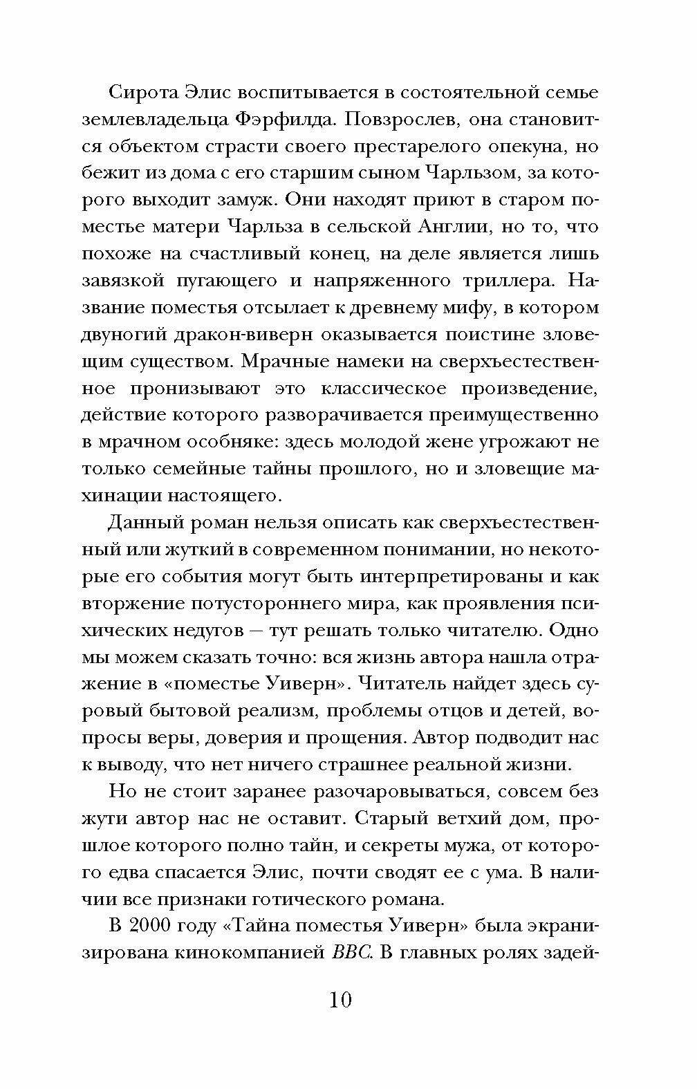 Впервые на русском языке — классический роман известного ирландского мастера готической прозы Джозефа Шеридана Ле Фаню «Тайна поместья Уиверн». Это история упадка и возрождения мелкодворянской семьи, которой необходимо преодолеть взаимное непонимание и вынужденную бедность, а также разобраться с довлеющим прошлым. Борьба героев за собственное счастье и коварные интриги завистников, полная тягот повседневная жизнь и вмешательство в нее почти что сверхъестественных сил, искренность и двуличность - вот антитезы, сталкивающиеся на страницах произведений выдающегося литератора, высоко ценимого М.Р. Джеймсом, Э.Ф. Бенсоном и самим Г. Ф. Лавкрафтом.