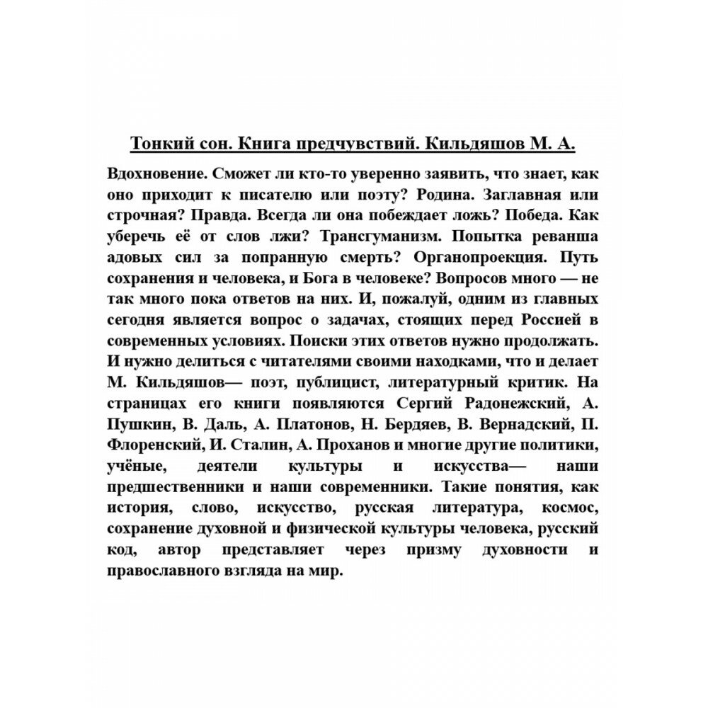 Вдохновение. Сможет ли кто-то уверенно заявить, что знает, как оно приходит к писателю или поэту? Родина. Заглавная или строчная? Правда. Всегда ли она побеждает ложь? Победа. Как уберечь её от слов лжи? Трансгуманизм. Попытка реванша адовых сил за попранную смерть? Органопроекция. Путь сохранения и человека, и Бога в человеке? Вопросов много — не так много пока ответов на них. И, пожалуй, одним из главных сегодня является вопрос о задачах, стоящих перед Россией в современных условиях. Поиски этих ответов нужно продолжать. И нужно делиться с читателями своими находками, что и делает М. Кильдяшов — поэт, публицист, литературный критик. На страницах его книги появляются Сергий Радонежский, А. Пушкин, В. Даль, А. Платонов, Н. Бердяев, В. Вернадский, П. Флоренский, И. Сталин, А. Проханов и многие другие политики, учёные, деятели культуры и искусства — наши предшественники и наши современники. Такие понятия, как история, слово, искусство, русская литература, космос, сохранение духовной и физической культуры человека, русский код, автор представляет через призму духовности и православного взгляда на мир.