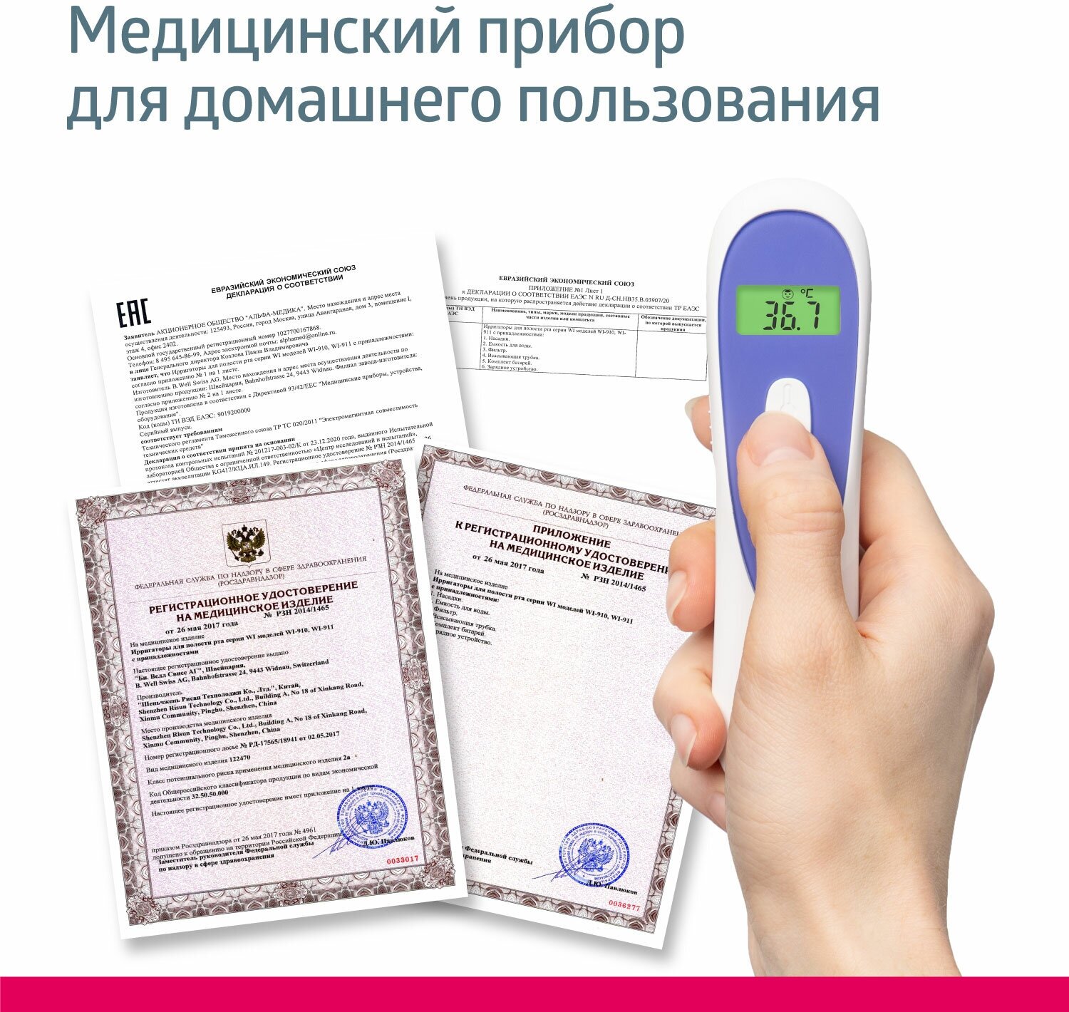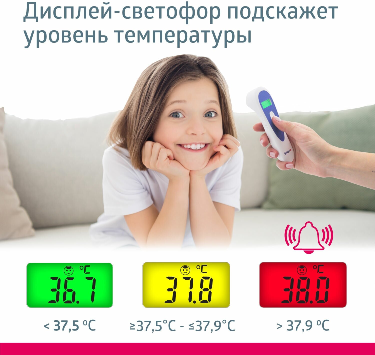 Инфракрасный термометр медицинский бесконтактный MED-3000 от бренда B.Well. Разработан и протестирован швейцарскими экспертами в области медицинской техники для дома.B.Well предоставляет 2 года гарантии на термометр MED-3000. Срок бесплатного сервисного обслуживания — 10 лет.Термометр инфракрасный медицинский MED-3000 проводит высокоточное измерение за 1 секунду. Чувствительный датчик позволяет мгновенно получить результат.Термометр цифровой MED-3000 удобен для всей семьи. Используйте его как бесконтактный инфракрасный термометр для новорожденных, детей постарше и взрослых. Измерять можно не только температуру тела. Термометр бесконтактный медицинский также подходит для жидкостей, предметов, воздуха в помещении и на улице. Он универсален, поэтому может заменить собой другие домашние градусники.Инфракрасный термометр бесконтактный комфортно проводит измерения даже ночью. Синий светодиодный луч-индикатор помогает направить датчик точно в нужную область. а датчик расстояния определит правильное расстояние для измерения и проведёт измерение точно. Подсветка экрана и функция отключения звука позволяют не беспокоить сон Вашего младенца и близких.Понять результаты помогает дисплей-светофор. Зеленая, желтая и красная подсветка соответствуют нормальной, повышенной и высокой температуре тела. При значениях выше 37,9°С термометр бесконтактный детский издает короткие сигналы. Сигналы можно отключить.Чтобы оценить динамику температуры, используйте память прибора. Термометр электронный бесконтактный сохраняет до 25 результатов измерений. Это позволяет отследить температуру в динамике.Результаты удобно сравнить самому и показать врачу.В комплекте вы найдете: градусник электронный бесконтактный MED-3000, инструкцию, удобную сумку-чехол для хранения и набор батареек.
