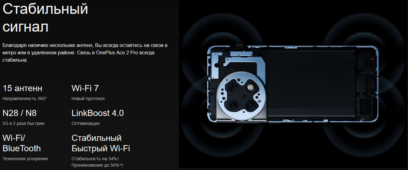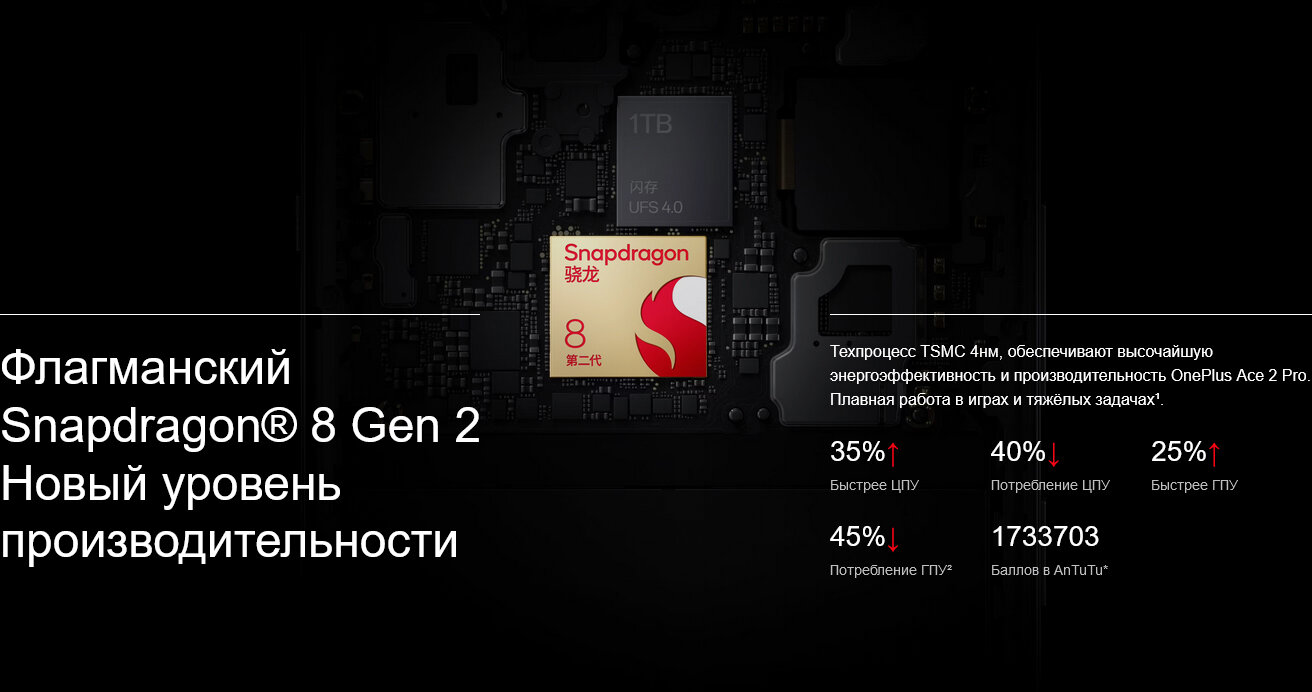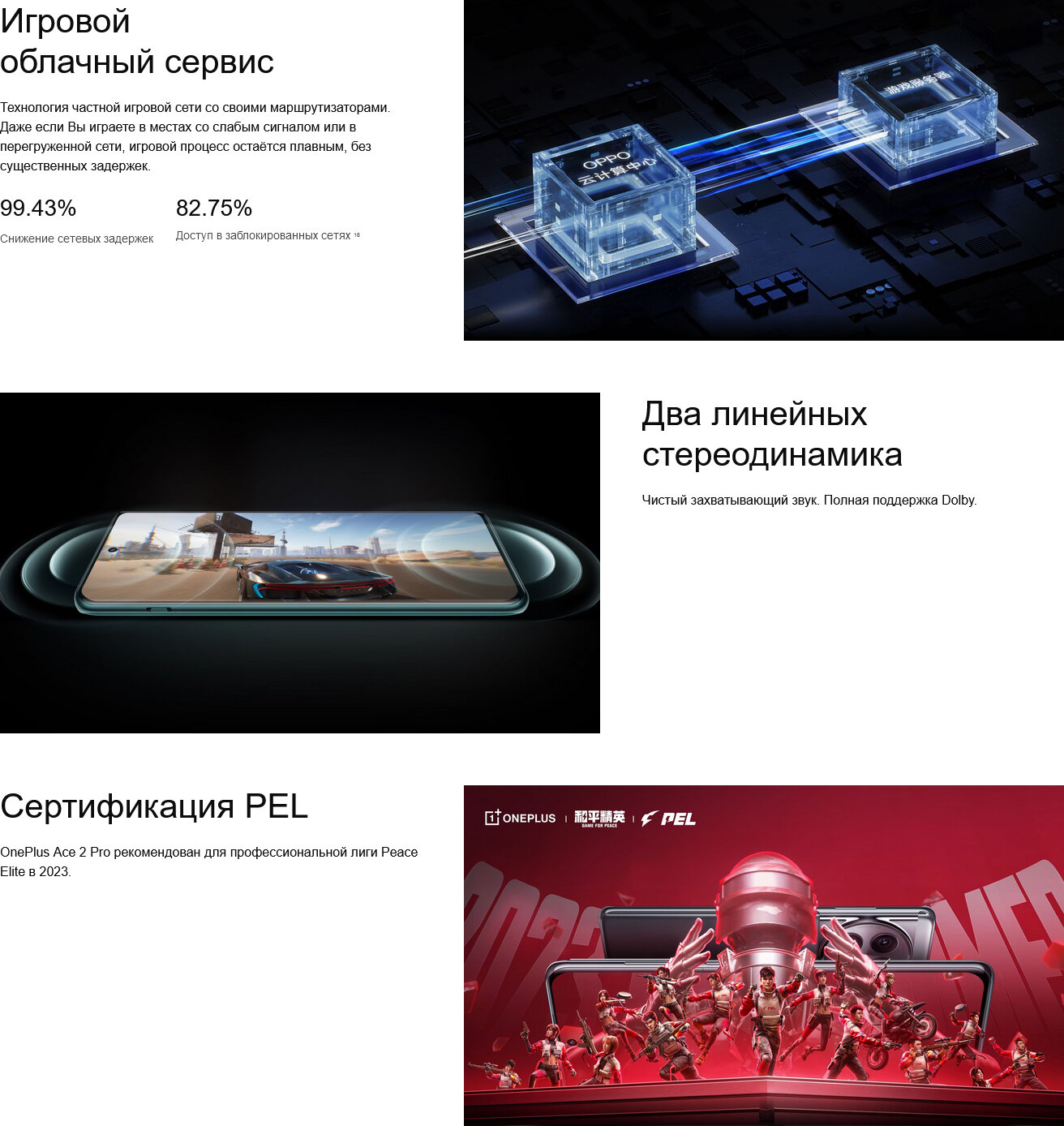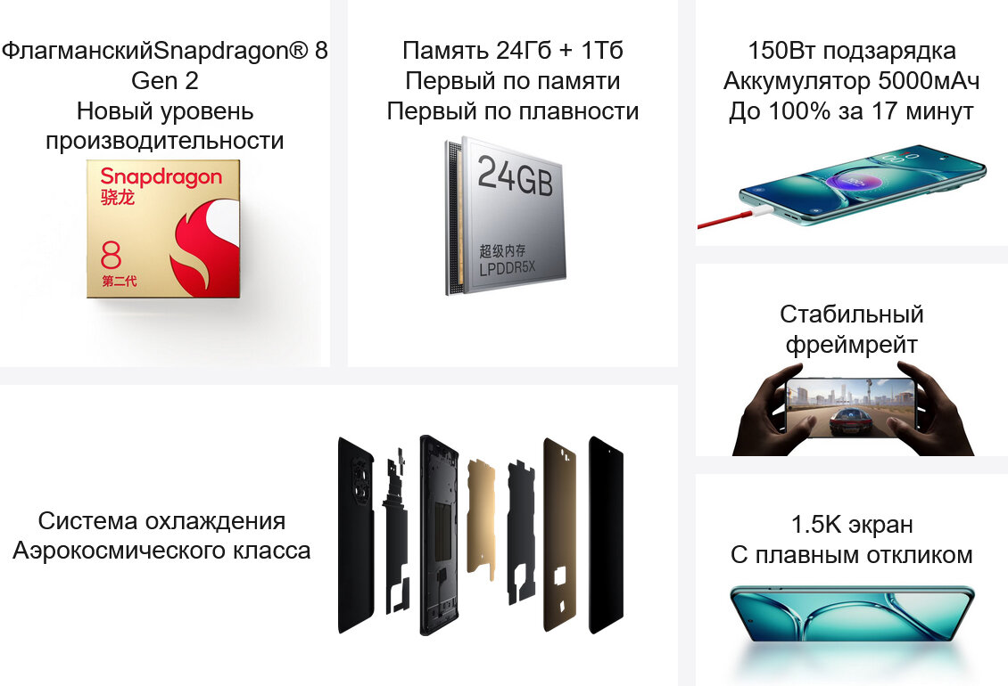 Смартфон OnePlus Ace 2 Pro 512 ГБ выполнен в корпусе серого цвета. Экран диагональю 6.74 дюйма занимает 93.9% площади передней панели. Панель 3D AMOLED со 100% покрытием sRGB обеспечивает четкое, яркое и детализированное изображение. Режим защиты глаз уменьшает вредное воздействие на зрение и снижает усталость. Платформа с процессором Snapdragon 8 Gen 2 обеспечивает быстродействие и плавность работы приложений.В круглом модуле расположены основной сенсор 50 Мп с оптической стабилизацией, сверхширокоугольный датчик 8 Мп, макрообъектив 2 Мп и двойная LED-вспышка. Для селфи-снимков установлена камера на 16 Мп с портретным режимом и эффектами улучшения изображения. Акустическая система с парой стереодинамиков и микрофонов формирует чистое насыщенное звучание. В смартфоне OnePlus Ace 2 Pro применятся 2-элементный аккумулятор суммарной емкостью 5000 мА*ч. Технология SuperVOOC с поддержкой выходной мощности 150 Вт позволяет с нуля набрать 100% примерно за 19 минут. Важно отметить, что адаптер не только оснащён разъёмом USB Type-C, но ещё и поддерживает сторонние технологии быстрой зарядки, включая Power Delivery до 45 Вт