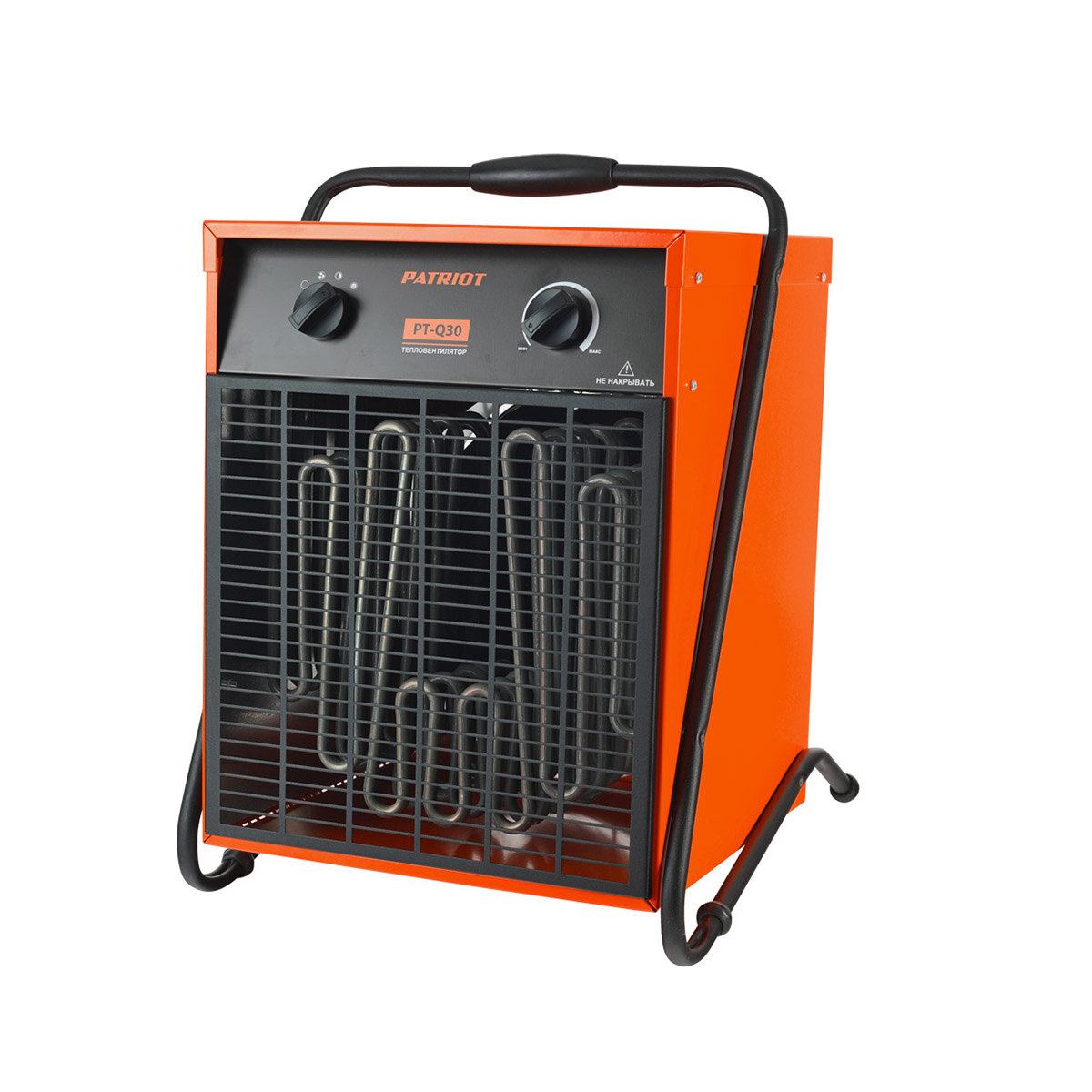 Patriot Тепловая пушка электрическая PT-Q 30 Тепловая пушка электрическая PATRIOT PT-Q 30 представлена в оранжевом корпусе с устойчивыми ножками. Оборудование оснащается двумя ступенями переключения мощности на 15 и 30 кВт, благодаря чему обладает производительностью 1700 м³/ч. Система способна работать в режиме простой вентиляции, полноценного обогрева или просушки. Прибор PATRIOT PT-Q 30 имеет в основе мощный ТЭН и регулируемый термостат. Агрегат способен действовать непрерывно до 22 часов. Двигатель дополняется эффективной системой защиты от перегрева. Корпус устройства дополнен удобной рукояткой и покрытием, предотвращающим появление ржавчины.