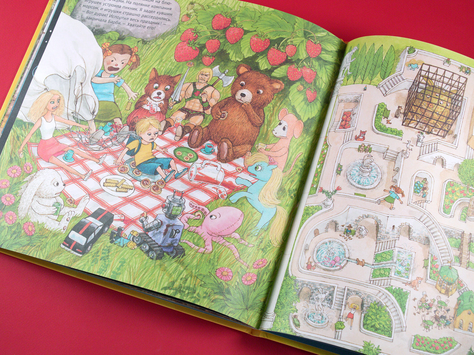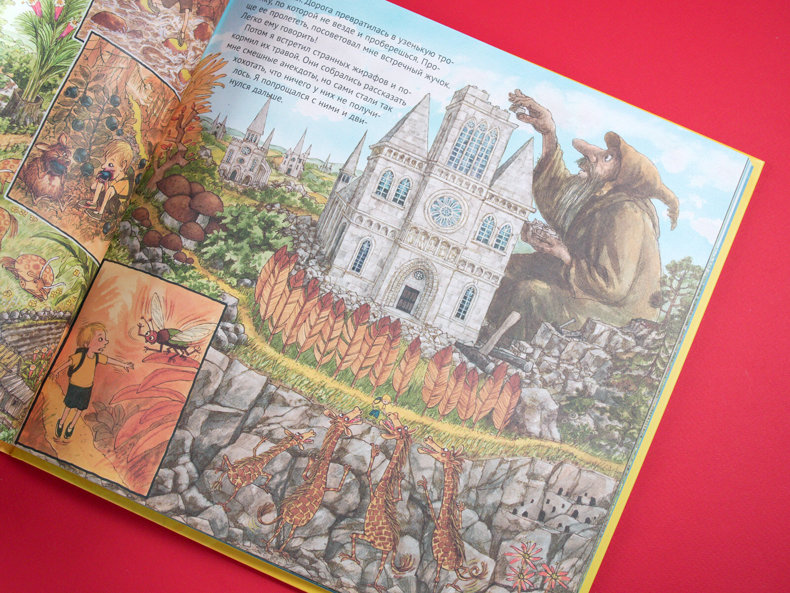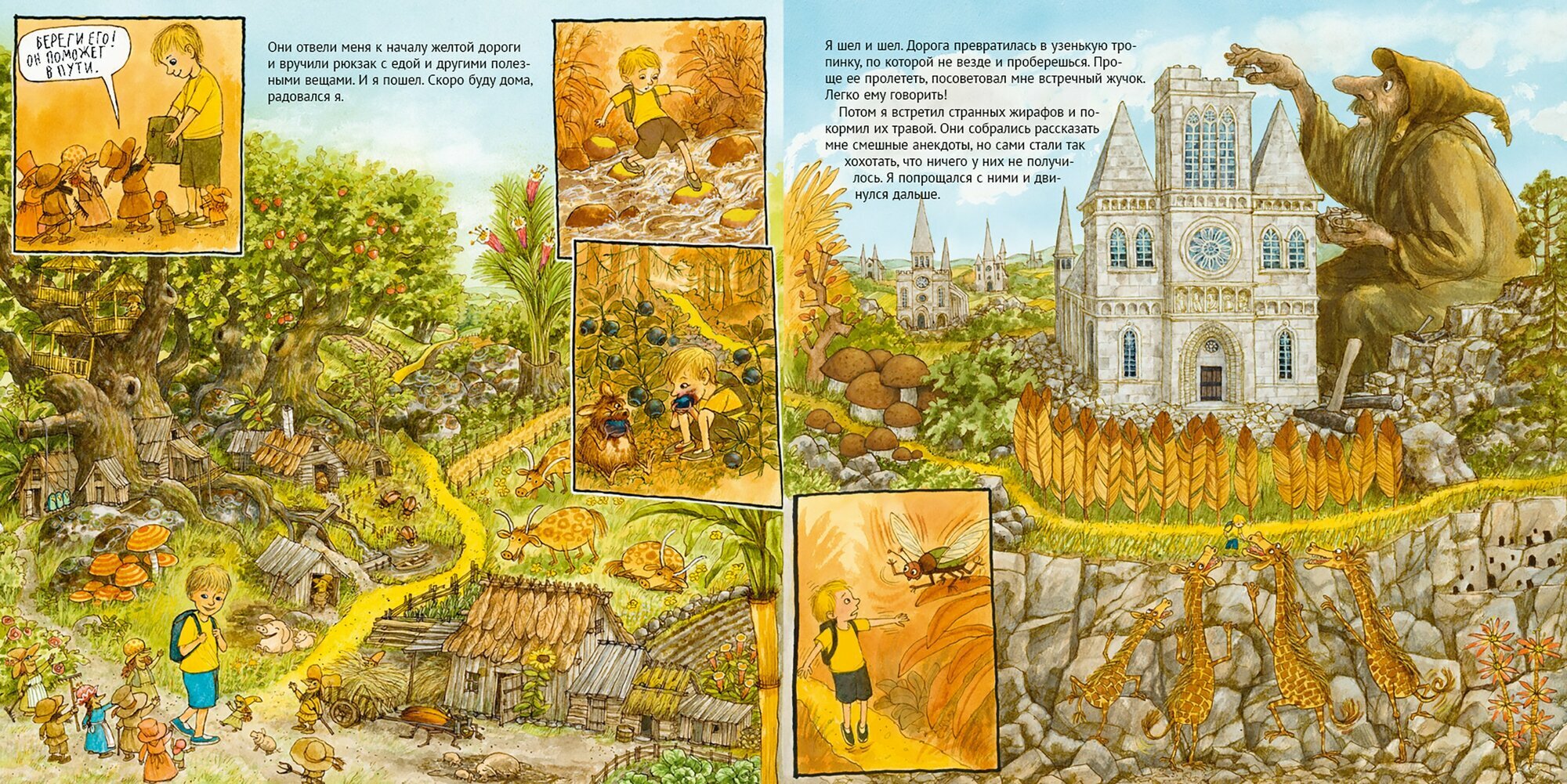 Мальчик очутился в незнакомом месте и не понимает, ни как сюда попал, ни как вернуться назад. Но на подмогу приходят маленькие человечки и Справочная бабушка. Важно все время следовать за желтой полоской: она обязательно выведет к дому. Желтая дорога вьется между скал, где странные жирафы травят анекдоты, ныряет в лес, населенный добрыми троллями, приводит в пустыню, уставленную кораблями и лодками, и превращается в желтую реку — а дальше и море, и остров, и замок принцессы, и лабиринт. На каждом повороте мальчика поджидают не только опасности, но и добрые помощники — то хулиганистые галки, то суровый капитан подводной лодки, то говорящий пес, то художница, рисующая волшебные картины. А в случае чего выручает подаренный человечками необыкновенный рюкзак.