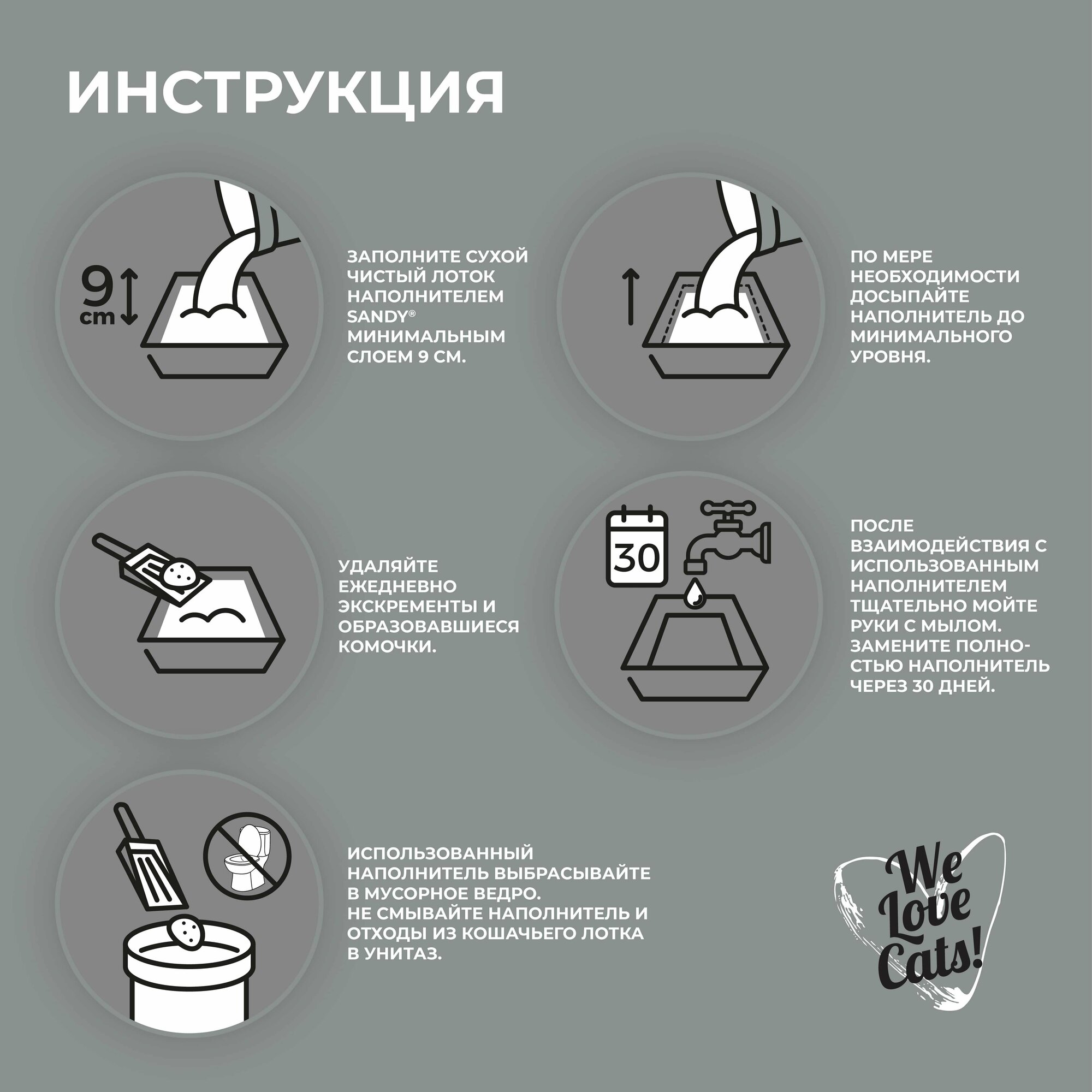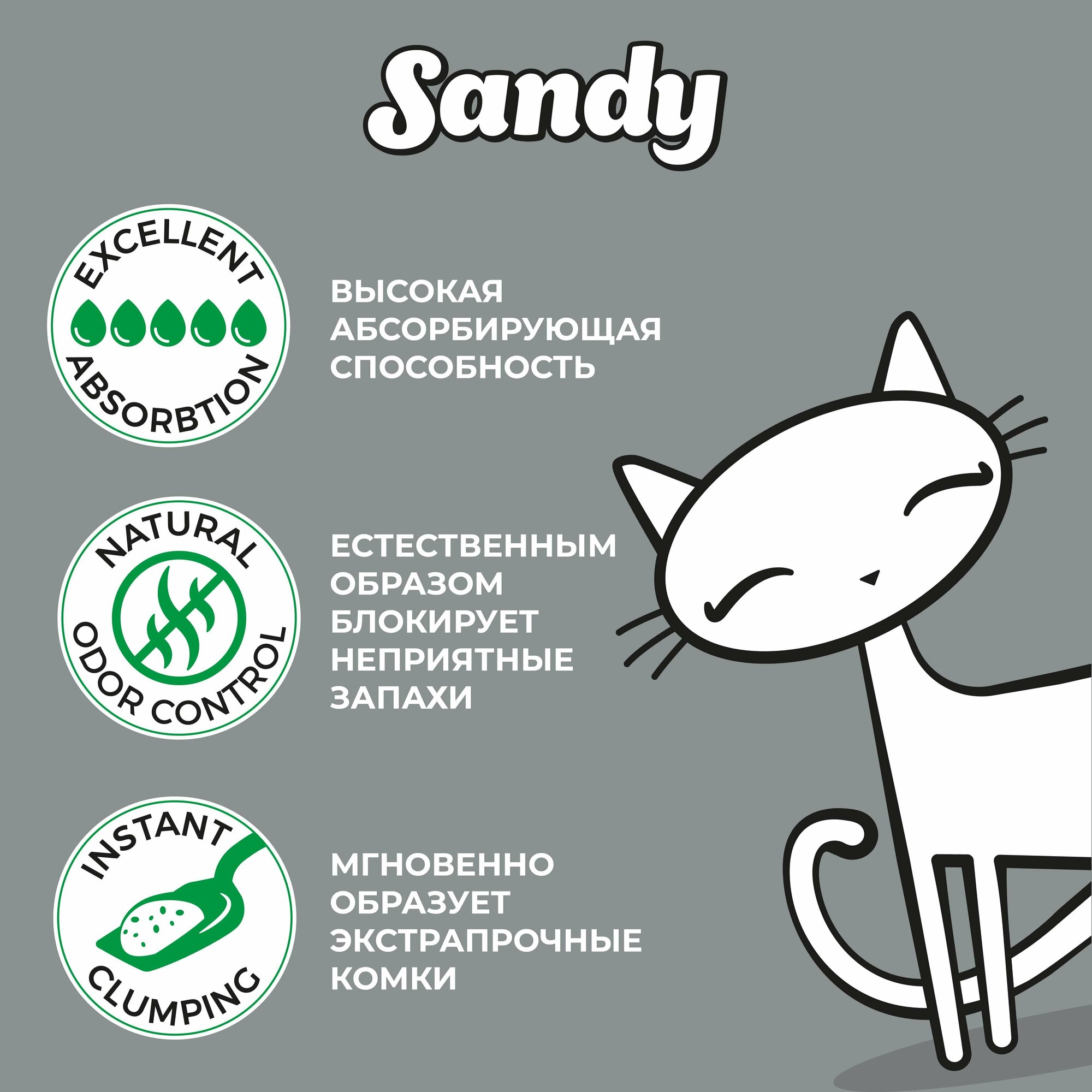 Sandy® Unscented – это суперпремиальный экстракомкующийся наполнитель из 100% натурального высококачественного натриевого бентонита. Серый натриевый бентонит обладает природными свойствами поглощать и надежно блокировать неприятные запахи. При правильном ежедневном использовании наполнителя Sandy® Unscented, нет необходимости применять освежители воздуха или другие маскирующие запах средства. Гранулы натриевой глины приятны для кошачьих лапок, а её благородный серый цвет дает кошкам естественное чувство комфорта, побуждая их пользоваться лотком. Sandy® Unscented гипоаллергенен, не содержит химических добавок. Не имеет ароматизаторов в составе и естественным образом поглощает неприятные запахи и блокирует пары аммиака. • Высокая абсорбирующая способность естественным образом блокирует неприятные запахи • Мгновенно образует экстрапрочные комки • Гипоаллергенный • Обеспылен на 99,9% • Экономичное использование Способ применения: • Заполните сухой чистый лоток наполнителем SANDY® минимальным слоем 9 см. • Удаляйте ежедневно экскременты и образовавшиеся комочки. • По мере необходимости досыпайте наполнитель до минимального уровня. • Использованный наполнитель выбрасывайте в мусорное ведро. • Не смывайте наполнитель и отходы из кошачьего лотка в унитаз. • После взаимодействия с использованным наполнителем тщательно мойте руки с мылом. 100% натриевый бентонит