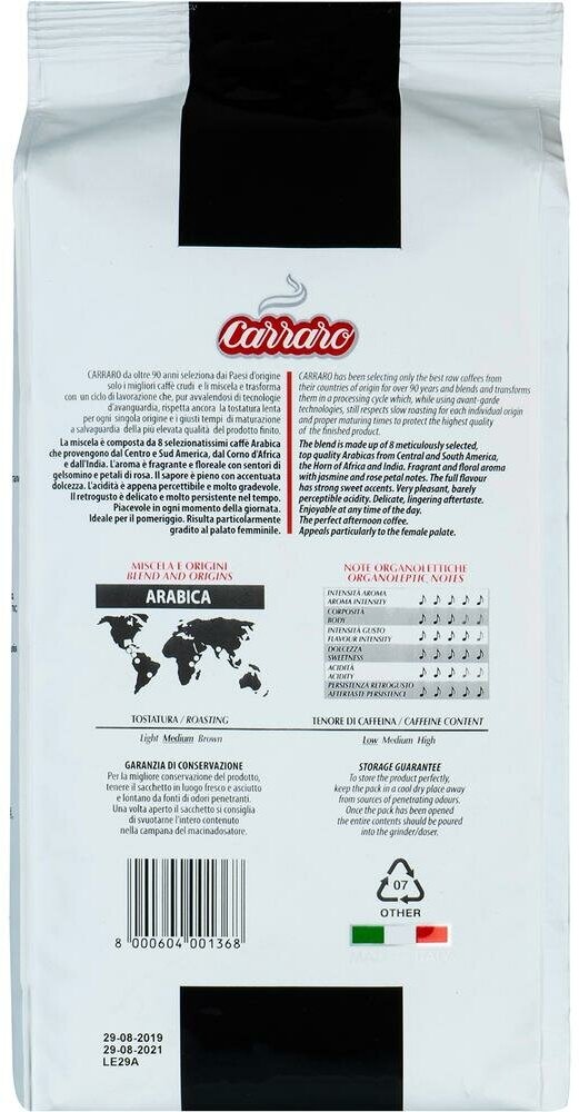 Кофеварки и кофемашины Carraro Dolci Arabica Кофе натуральный жареный в зернах Carraro Dolci Arabica является элитной смесью тщательно отобранных зерен Арабики, с насыщенным богатым вкусом и нежной, едва заметной кислинкой. Данная смесь предназначена для особо требовательных ценителей натурального кофе.