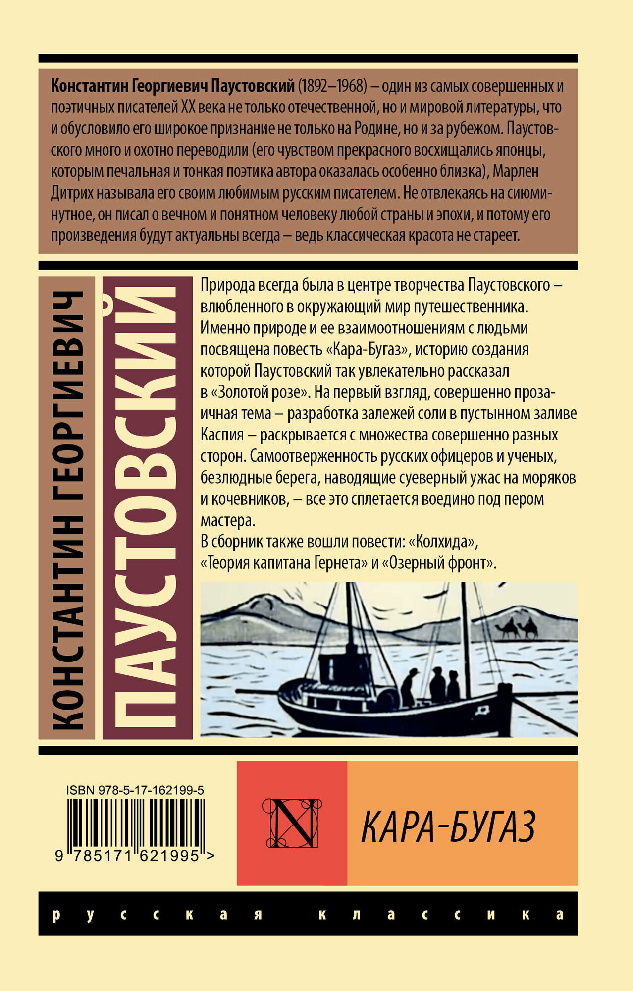 Природа всегда была в центре творчества Паустовского - влюбленного в окружающий мир путешественника. Именно природе и ее взаимоотношениям с людьми посвящена повесть "Кара-Бугаз", историю создания которой Паустовский так увлекательно рассказал в "Золотой розе". На первый взгляд, совершенно прозаичная тема - разработка залежей соли в пустынном заливе Каспия - раскрывается с множества совершенно разных сторон. Самоотверженность русских офицеров и ученых, безлюдные берега, наводящие суеверный ужас на моряков и кочевников, - все это сплетается воедино под пером мастера. В сборник также вошли повести: "Колхида", "Теория капитана Гернета" и "Озерный фронт".
