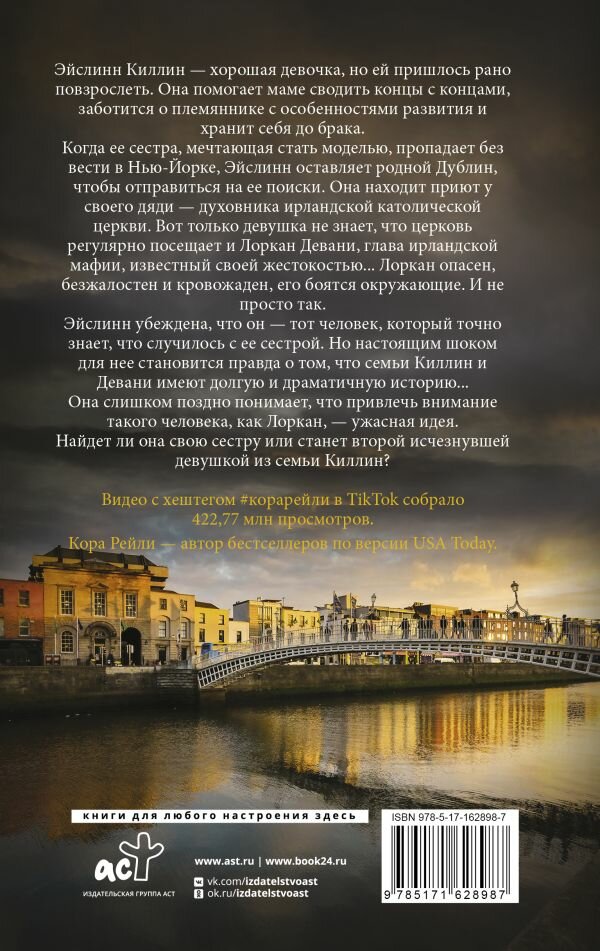 Эйслинн Киллин — хорошая девочка, но ей пришлось рано повзрослеть. Она помогает маме сводить концы с концами, заботится о племяннике с особенностями развития и хранит себя до брака.Когда ее сестра, мечтающая стать моделью, пропадает без вести в Нью-Йорке, Эйслинн оставляет родной Дублин, чтобы отправиться на ее поиски. Она находит приют у своего дяди — духовника ирландской католической церкви. Вот только девушка не знает, что церковь регулярно посещает и Лоркан Девани, глава ирландской мафии, известный своей жестокостью... Лоркан опасен, безжалостен и кровожаден, его боятся окружающие. И не просто так.Эйслинн убеждена, что он — тот человек, который точно знает, что случилось с ее сестрой. Но настоящим шоком для нее становится правда о том, что семьи Киллин и Девани имеют долгую и драматичную историю...Она слишком поздно понимает, что привлечь внимание такого человека, как Лоркан, — ужасная идея.Найдет ли она свою сестру или станет второй исчезнувшей девушкой из семьи Киллин?Кора Рейли — автор бестселлеров по версии USA Today.Видео с хештегом #корарейли в TikTok собрало 422.77 млн просмотров.