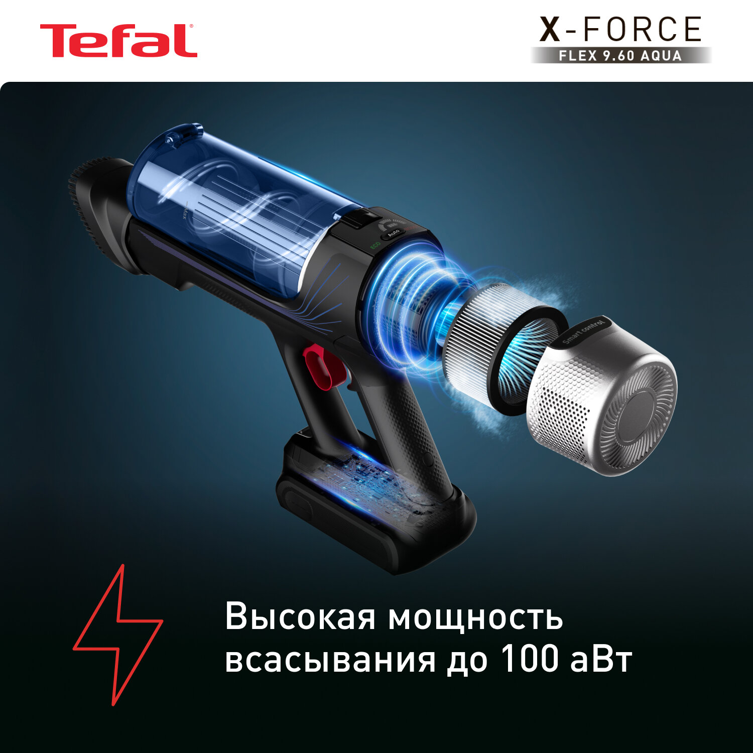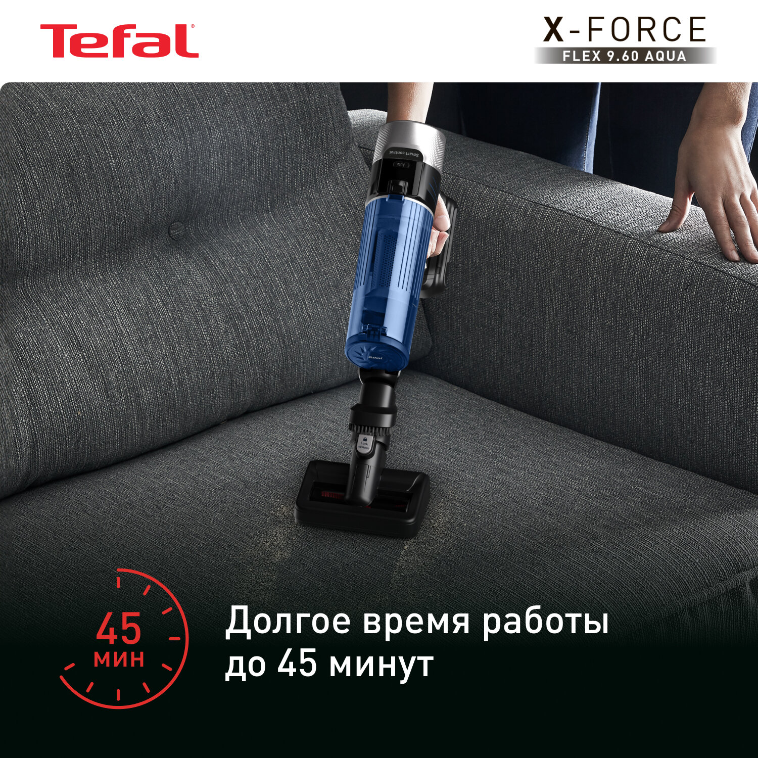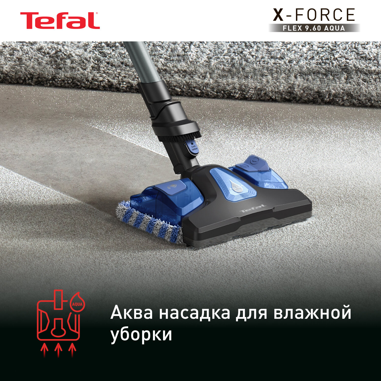 Беспроводной пылесос Tefal X-Force Flex 9.60 Aqua TY20C7WO с автоматической регулировкой мощности с насадкой для влажной уборки черный/синий XForce Flex 9.60