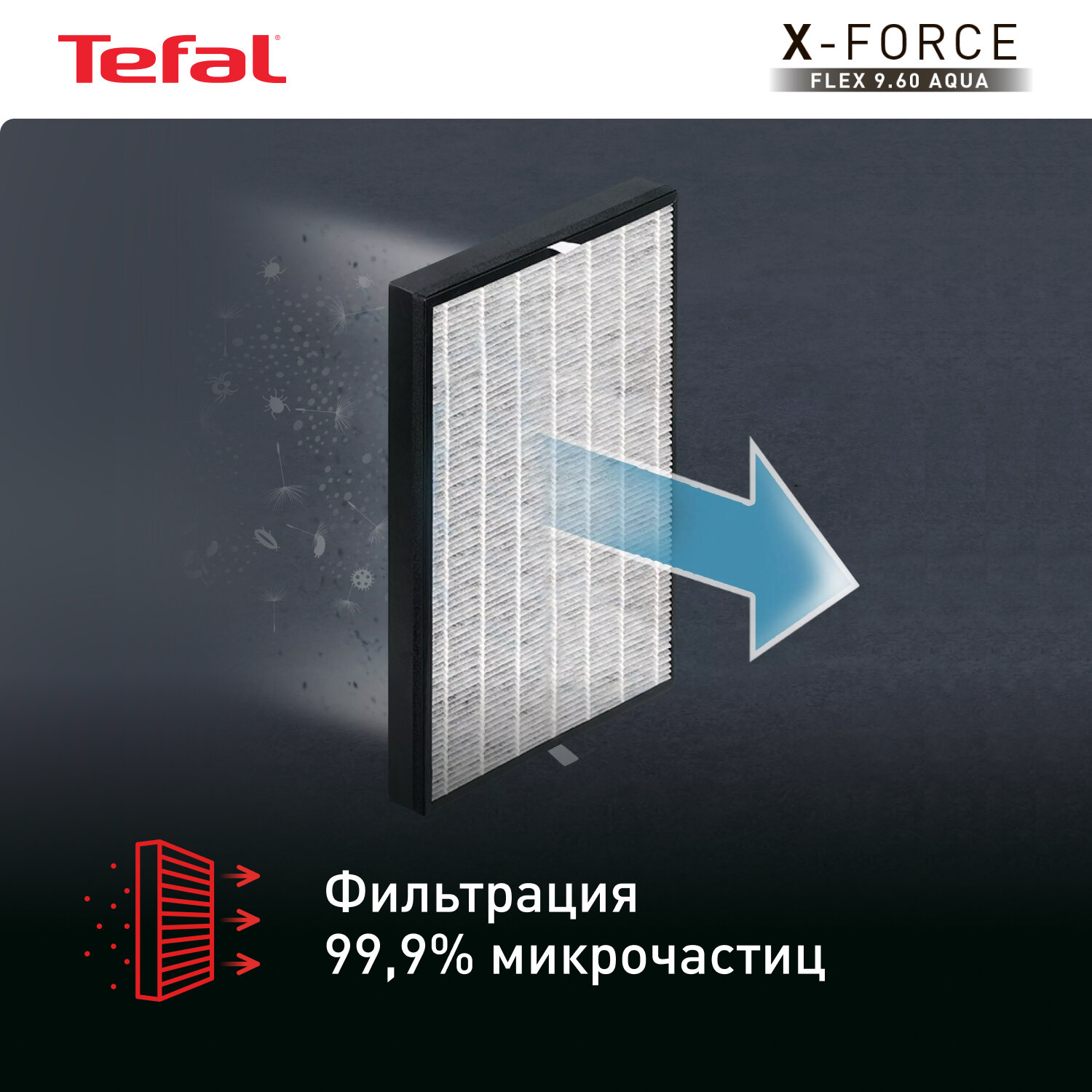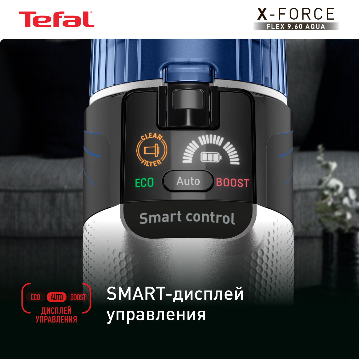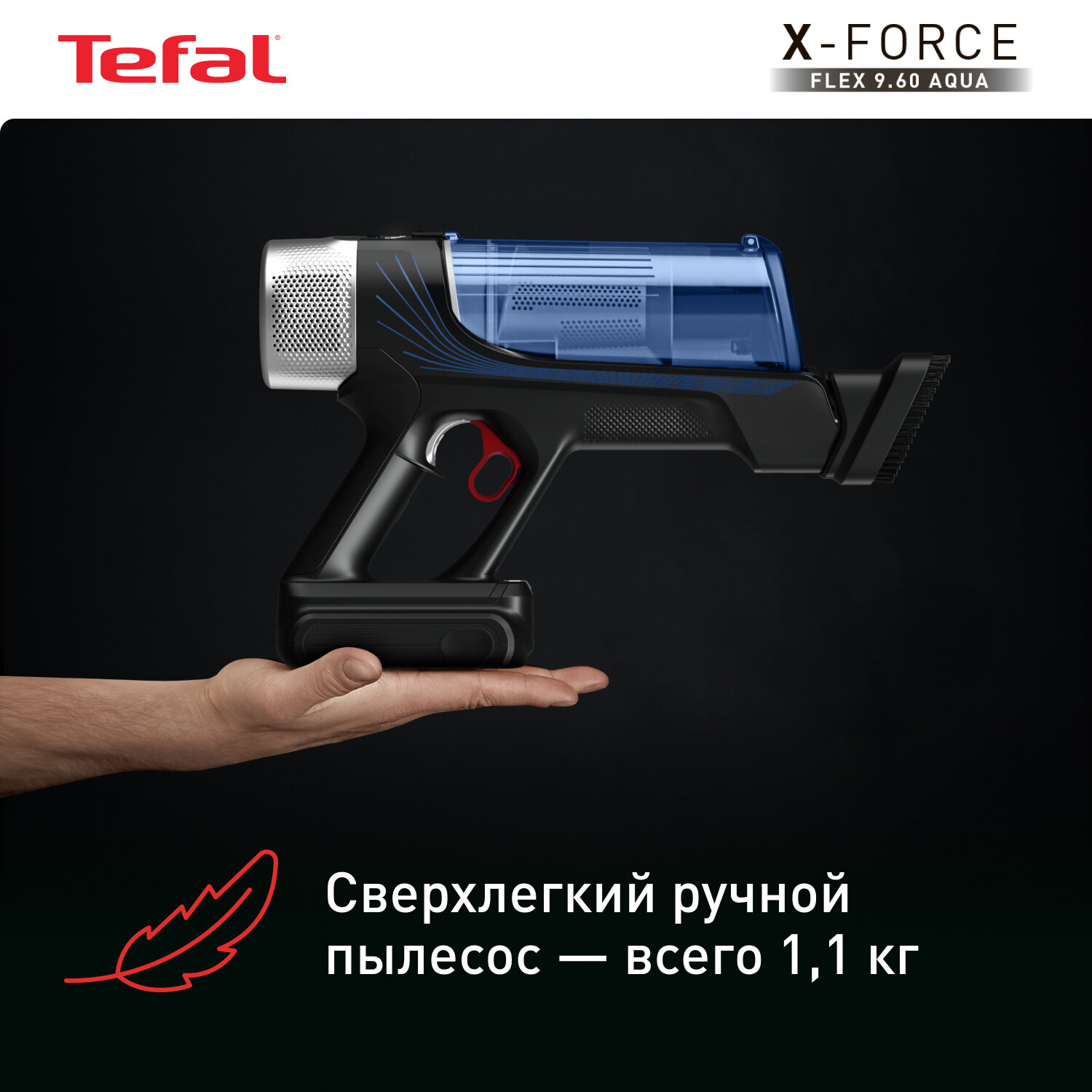 Беспроводной пылесос Tefal X-Force Flex 9.60 Aqua TY20C7WO с автоматической регулировкой мощности с насадкой для влажной уборки черный/синий XForce Flex 9.60