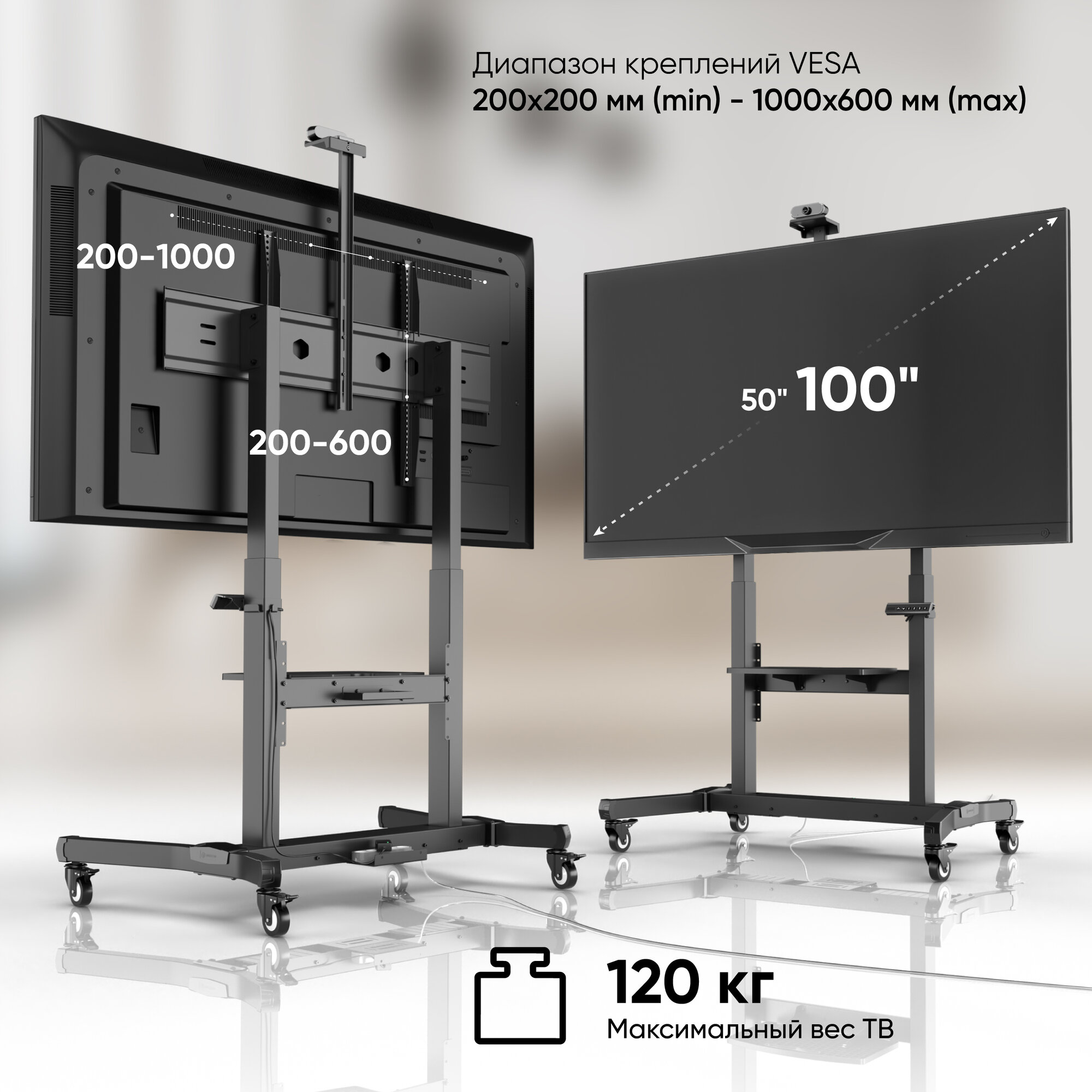 Стойка совместима с большинством моделей современных телевизоров, среди которых Samsung, LG, Sony, KIVI, Tcl, Xiaomi M, и интерактивных панелей, таких как Newline, Lumien, Absen, Classic Solution, Smart Board и других. Она также подойдет для размещения экранов с разными стандартами VESA: от 200×200 до 1000×600 мм.