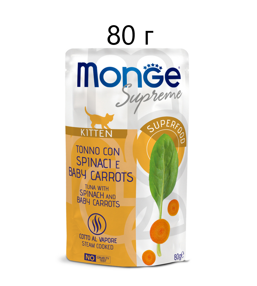 Monge Kitten Влажный корм (пауч) для котят тунец шпинат и мини-морковь 80 гр.