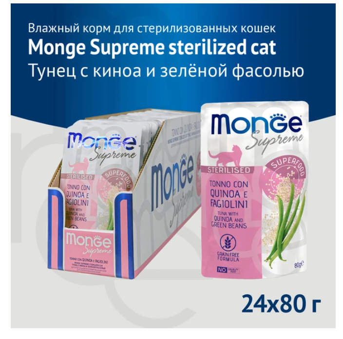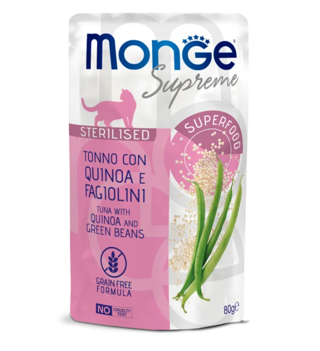 Влажный корм для кошек Monge Supreme cat Sterilized TONNO con QUINOA e FAGIOLINI, тунец с киноа и зелёной фасолью. Дополнительный консервированный корм для стерилизованных кошек. Не полнорационный корм. Настоящий деликатес для четвероногих гурманов приготовленный на пару из высококачественных продуктов на основе свежего тунца, который является источником белка высокой пищевой ценности. Продукт обогащен суперфудами, витамином Е и ФОС и не содержит злаков, искусственных добавк. Без ГМО, искусственных красителей и ароматизаторов. Сделано в Таиланде.