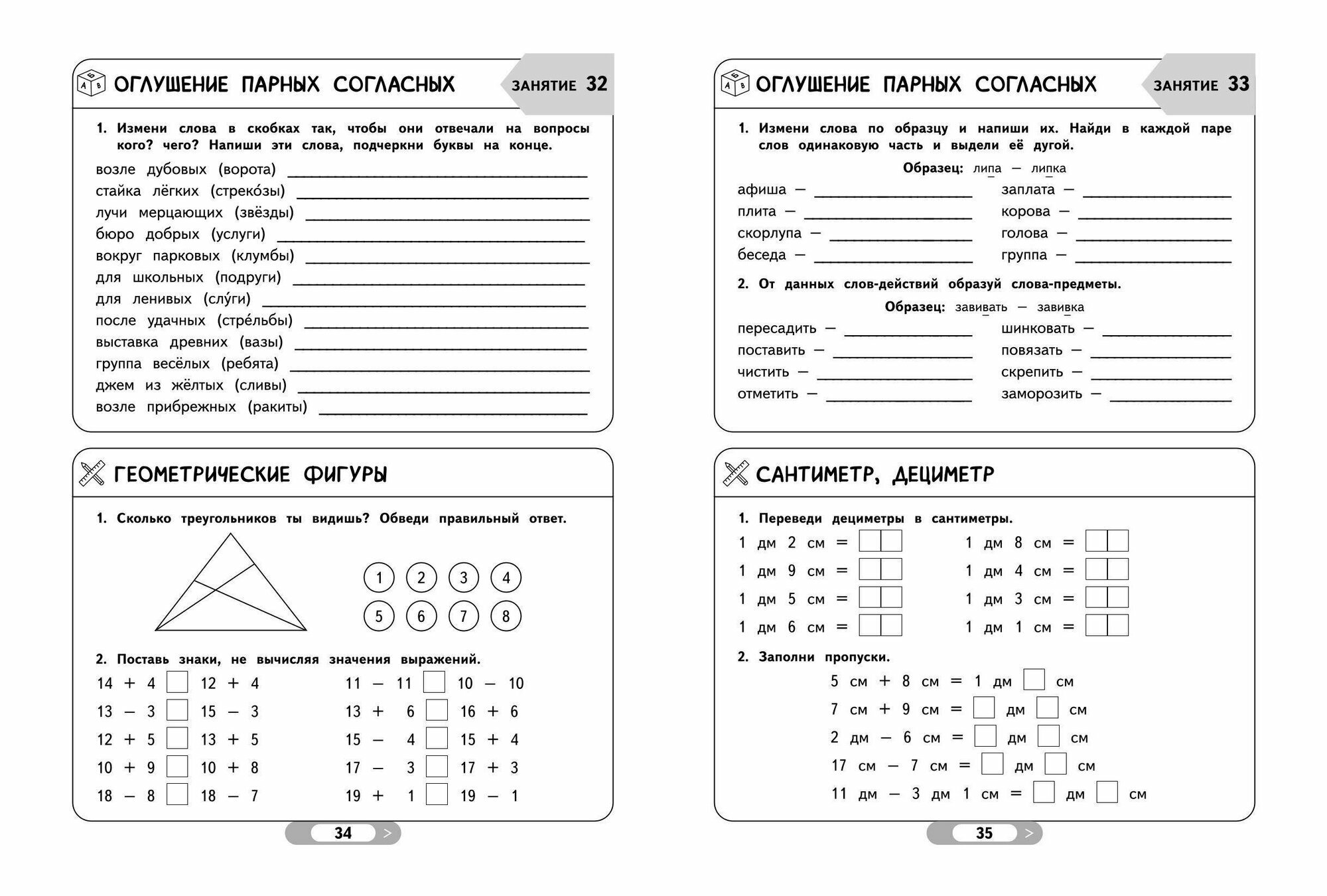 Задания по русскому языку и математике, имеющиеся на одной странице нужно выполнять в один день, повторяя сразу два предмета. В конце пособия имеются ответы, в которые можно заглянуть в случае затруднения.