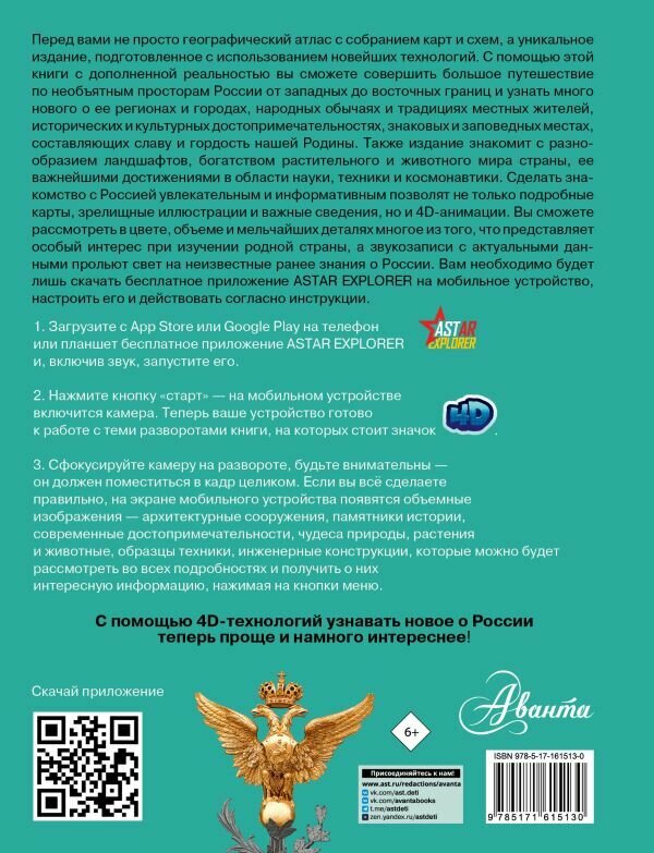 Энциклопедия-атлас с дополненной реальностью станет вашим гидом в увлекательном путешествии по России. Он расскажет о республиках, краях и областях Российской Федерации, ее крупнейших мегаполисах, таких как столица нашей Родины Москва, главный культурный центр Санкт-Петербург, самый большой город Сибири Новосибирск, краса и гордость Татарстана Казань и многих других. Здесь же содержится интересная информация о городах поменьше, входящих в список "Золотое кольцо России", а также древних селениях, ставших музеями под открытым небом. Вы сможете лучше изучить географию нашей страны, ее растительный и животный мир, природные богатства, достижения науки и техники. Важные сведения и любопытные факты в этой книге приведены в сопровождении огромного количества зрелищных иллюстраций, позволяющих познакомиться с величественными православными храмами и мусульманскими мечетями, великолепными дворцами, неприступными средневековыми башнями и боевыми крепостями, самыми протяженными мостами и грандиозными дамбами, загадочными дольменами и мистическими скальными образованиями, таинственными пещерами и огнедышащими вулканами, высочайшими горными пиками и красивейшими водопадами, удивительными обитателями живой природы и впечатляющими образцами отечественной техники. Но главное - использование новейших 4D-технологий позволит рассмотреть многочисленные природные, культурные и исторические достопримечательности нашей страны со всех сторон, в цвете и объеме, а познавательные сообщения о них прослушать в звукозаписи. Для этого вам нужно будет лишь скачать бесплатное приложение ASTAR EXPLORER и действовать согласно несложной инструкции.