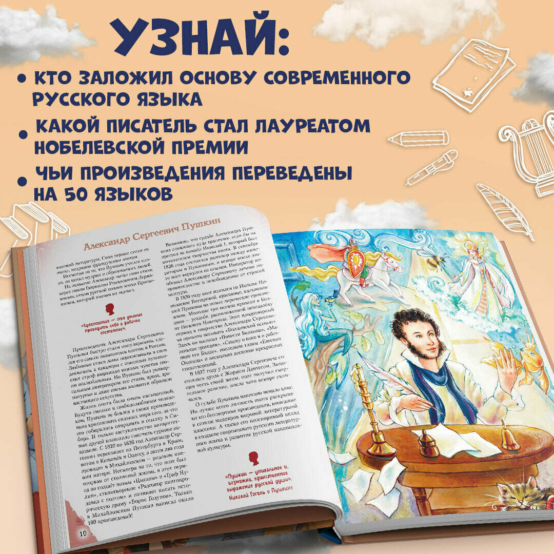 Эта книга патриотической серии «Великие люди великой страны» рассказывает о двадцати наших знаменитых соотечественниках — поэтах, прозаиках, баснописцах, публицистах, издателях и драматургах, чьи имена навсегда останутся в истории России. Кто положил основу современному русскому языку? Какой писатель стал лауреатом Нобелевской премии по литературе? Чьи произведения были переведены на 50 языков мира?