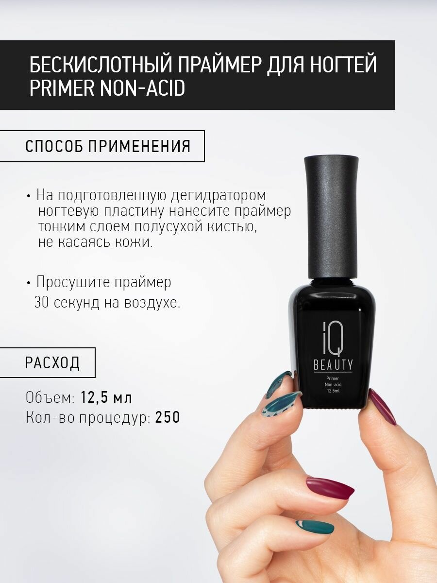 Primer Non-acid от IQ BEAUTY – профессиональное средство для повышения адгезии искусственного покрытия с ногтем и увеличения стойкости и носкости покрытия без сколов и отслоек. Праймер выступает в роли 2-х стороннего скотча, который обеспечивает усиленное сцепление ногтевой пластины и искусственного материала.