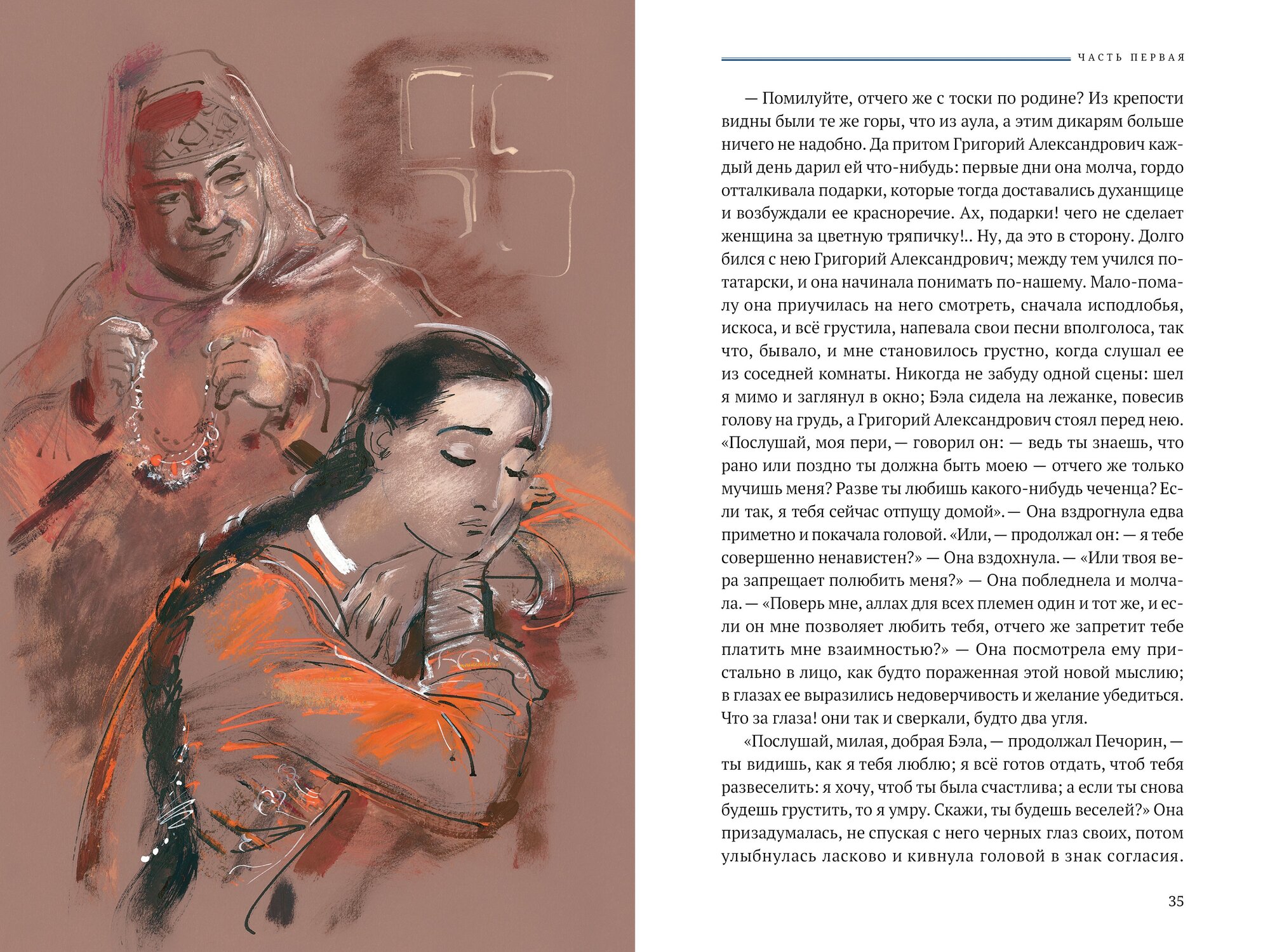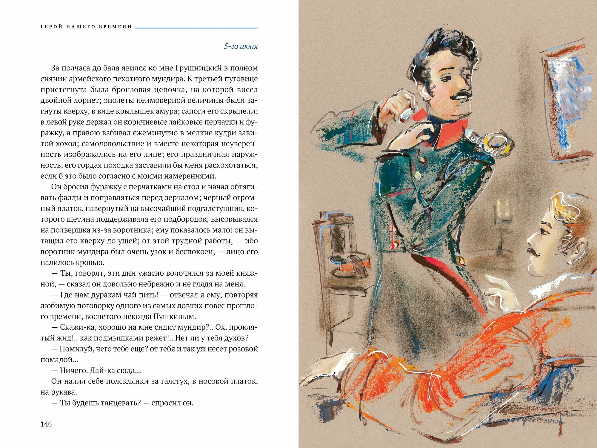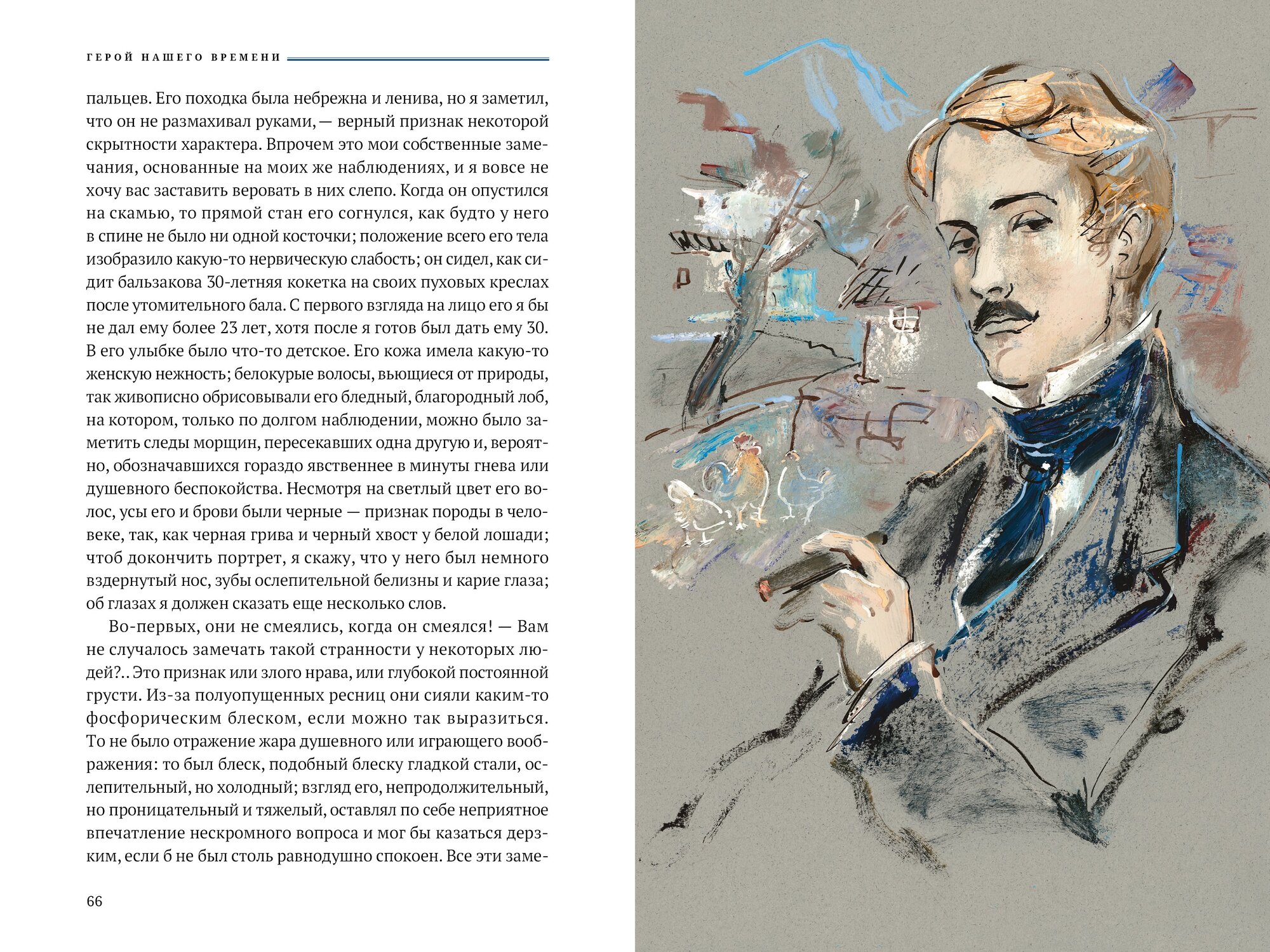 "Герой нашего времени" и "Маскарад" Михаила Юрьевича Лермонтова (1814-1841) - главные тексты писателя. Созданный им образ Печорина стал примером человека думающего, страстного, но опустошенного, разочарованного. Писатель впервые представил в русской литературе столь сложный психологический, философский тип личности. В драме же он изобразил героя, противостоящего существующему порядку вещей. Арбенин - истинный романтический персонаж, движимый тоской по счастливой жизни. Ольга Граблевская - современный художник, чью манеру отличает плотность красок, легкость линии, экспрессия рисунка. Она создала наиболее масштабные циклы иллюстраций к лермонтовским произведениям, которые были отмечены как прекрасные образцы искусства книжной графики. Роман Михаила Юрьевича Лермонтова (1814-1841) "Герой нашего времени" открыл читателю образ человека думающего, противоречивого, разочарованного. Текст выстроен как разгадка тайны Печорина. В частях-новеллах раскрываются разные стороны его личности. В драме "Маскарад" представлен настоящий романтический бунтарь Арбенин. Страсть, подчиняющая его, ведет к самым губительным последствиям. Оба произведения - наиболее яркие образцы лермонтовского художественного стиля. Его особенности отражают иллюстрации современной художницы Ольги Граблевской. Цвет, линии, портретные зарисовки, сценки - это мир роковых вращений, обмана, погружения в темноту прозрения и движение к неземной красоте.