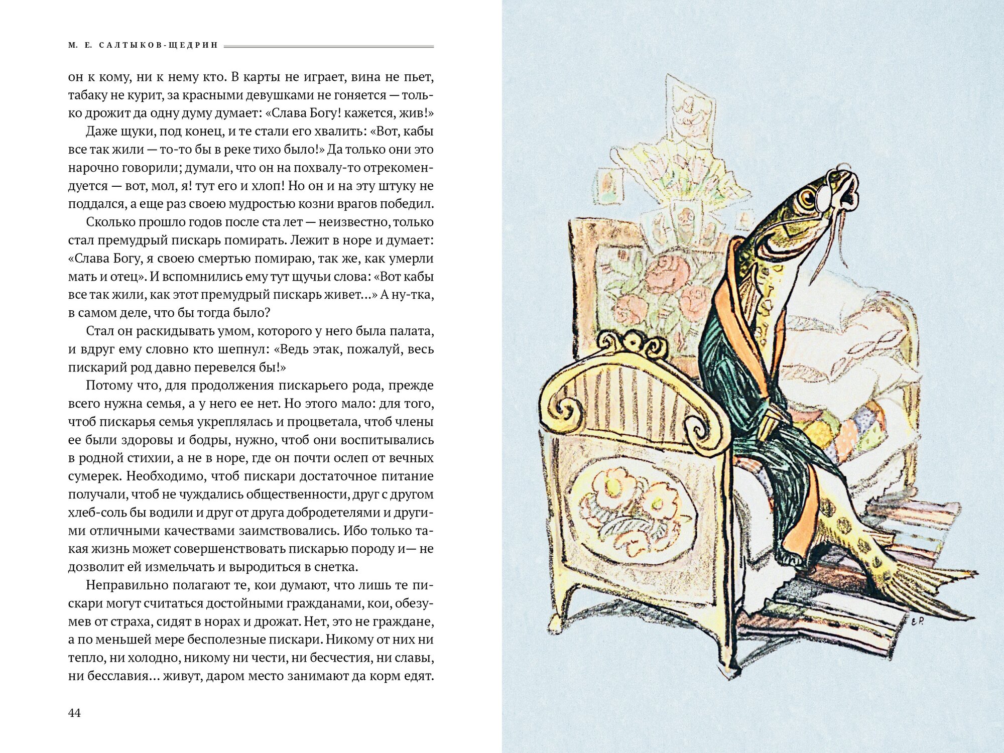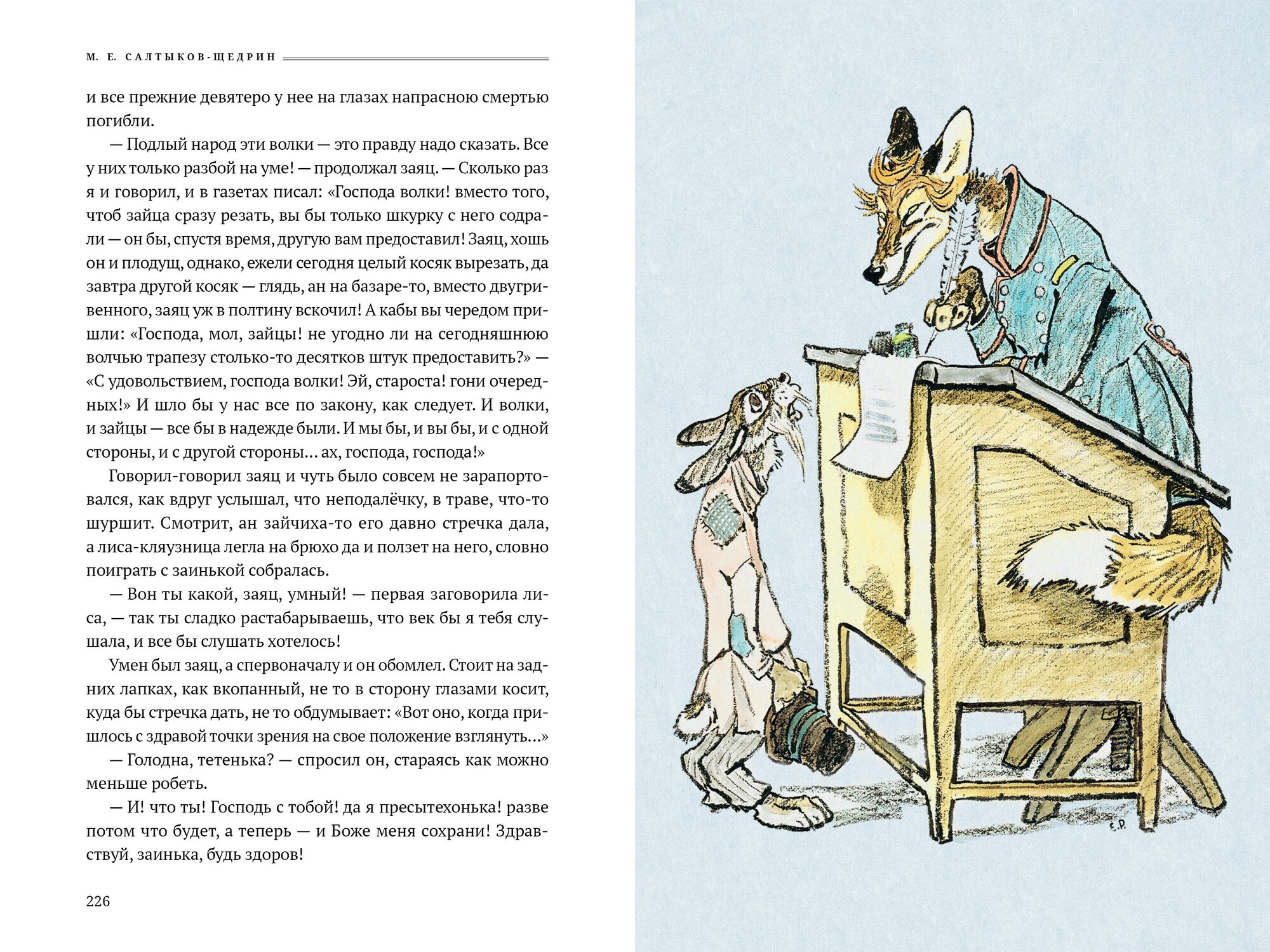 Михаил Евграфович Салтыков-Щедрин (1826-1889) с беспощадной честностью смотрел на ход отечественной истории и общественные нравы. От его сатирического и саркастического взгляда не укрылась ни одна сторона российской жизни. "Сказки" - это своеобразный итог творчества писателя. В них дана аллегорическая, гротескная картина мира, в которой показаны все искажения и изъяны человеческого поведения. Иллюстрации к сказкам М. Е. Салтыкова-Щедрина созданы Евгением Михайловичем Рачевым (1906-1997). Художник уловил природу смеха писателя, отчего они столь же аллегоричны и сатиричны, как и сами сказки. При этом он стремился к исторической достоверности деталей и костюмов и точности изображения фигур персонажей, их эмоций и характеров. Сказки М. Е. Салтыкова-Щедрина (1826-1889), наряду с романом "Господа Головлевы" и "Историей одного города", представляют собой вершину творчества великого русского сатирика-провидца. В них переплелись иносказание, ирония, гипербола, фантастика. В сказочных историях высвечены все представители русского общества. И эти картины окрашены горечью мыслителя, видящего тяжесть и даже безысходность русской жизни. Сатиричность и фантасмагоричность образов передают иллюстрации Евгения Михайловича Рачева (1906-1997), известного художника-анималиста. Подчеркивая идеи писателя, они обнаруживают их непреходящую актуальность.