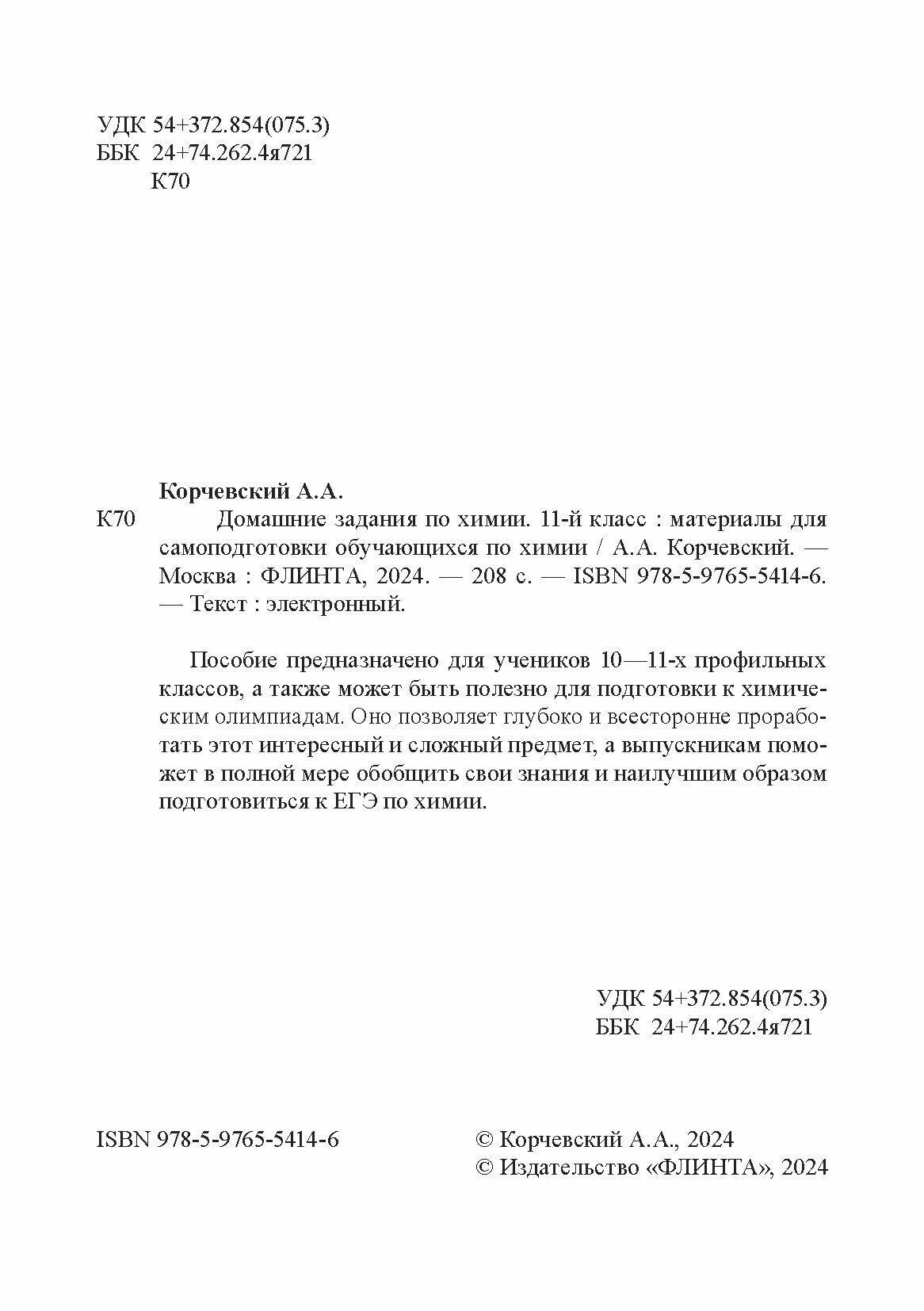 Домашние задания по химии. 11 класс. Материалы для самоподготовки обучающихся по химии (Алексей Анатольевич Корчевский); Флинта, 2024