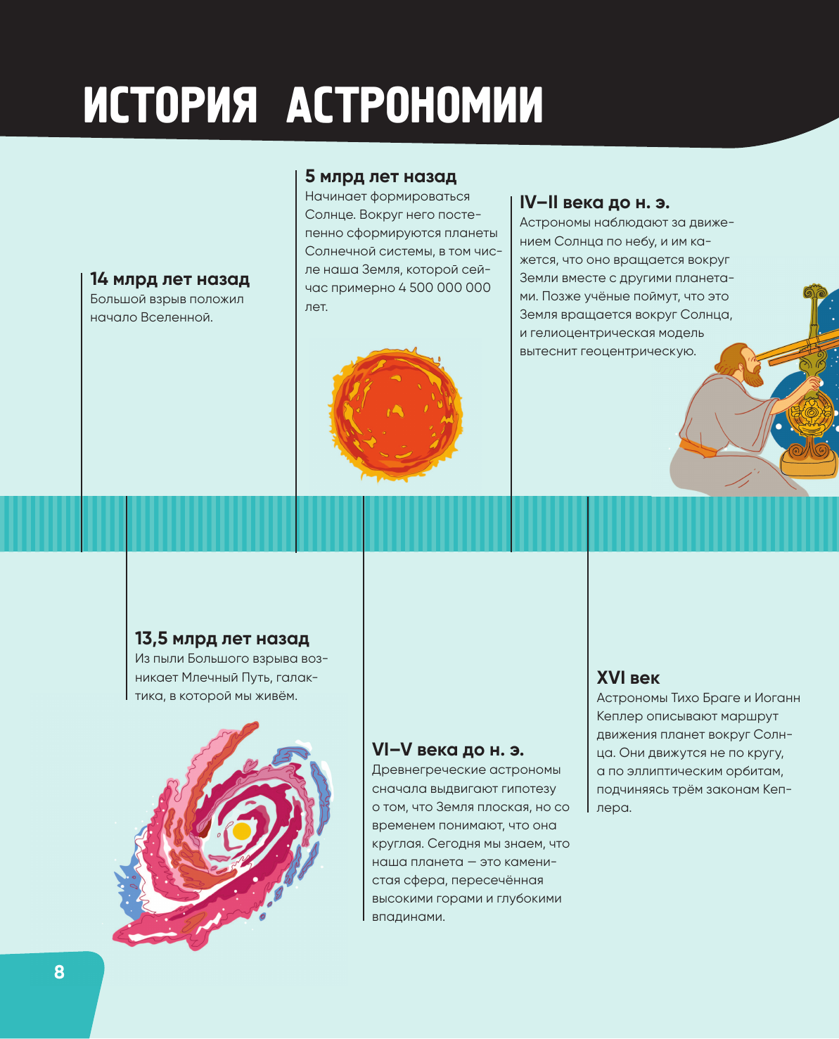 Большая яркая энциклопедия - прекрасный помощник для школьника в изучении секретов Вселенной. Ребенок узнает, зачем людям понадобилась астрономия, как рождаются звезды и сколько раз это может с ними происходить, что ждет отважных исследователей космоса за пределами Солнечной системы и многое другое. Юный читатель найдет ответы на все вопросы и станет настоящим исследователем космоса! Эта космическая энциклопедия отличается прекрасным взвешенным изложением научных фактов и дает полноценное представление о причинах, структуре, процессах, не перегружая юного читателя. Разнообразная подача информации не даст заскучать: в книге множество увлекательных схем, ленты времени, макеты Солнечной системы и космических кораблей, карты небесных тел, а также словарь полезных слов. Издание рекомендовано детям среднего школьного возраста. Красочная увлекательная книга станет прекрасным подарком по любому поводу!