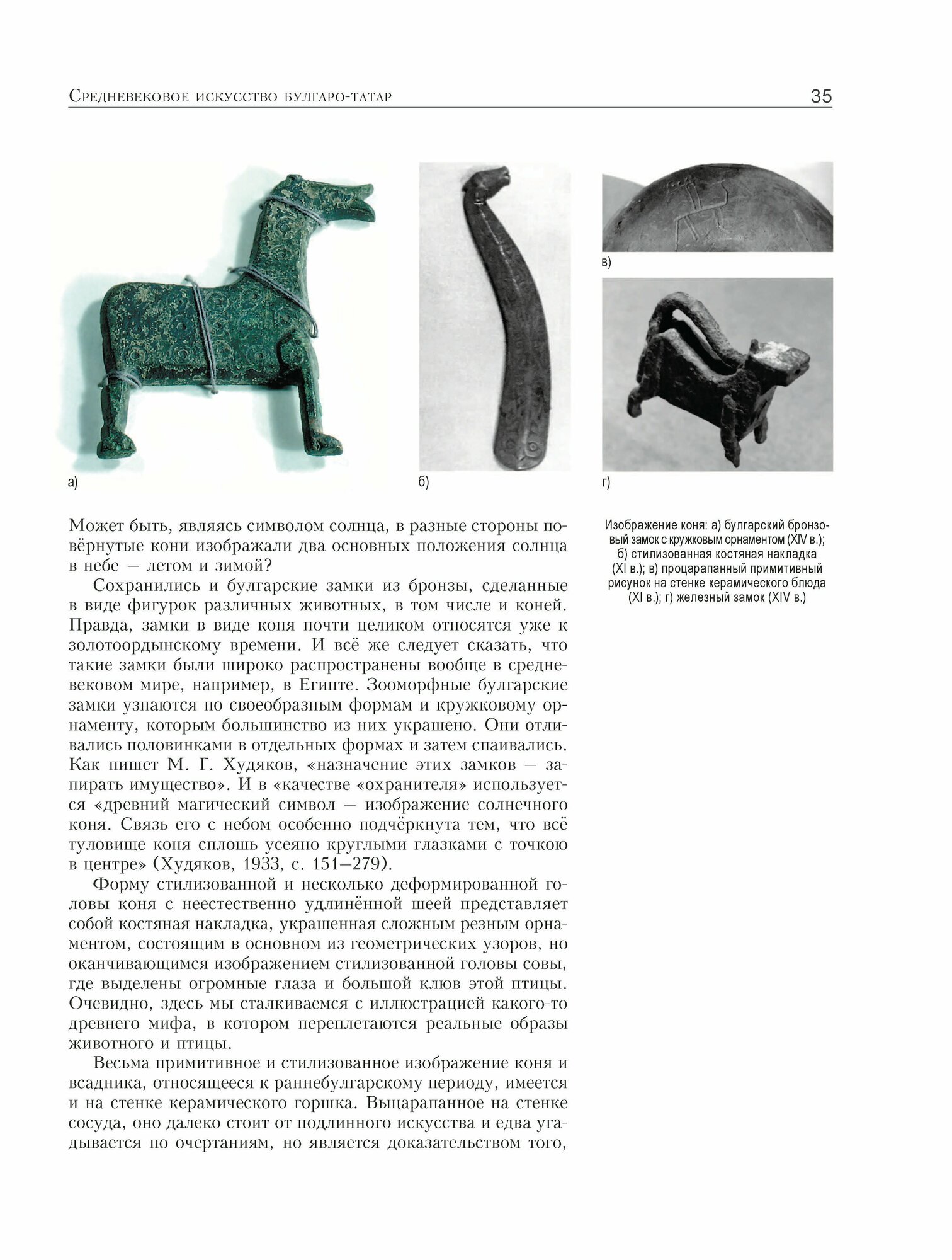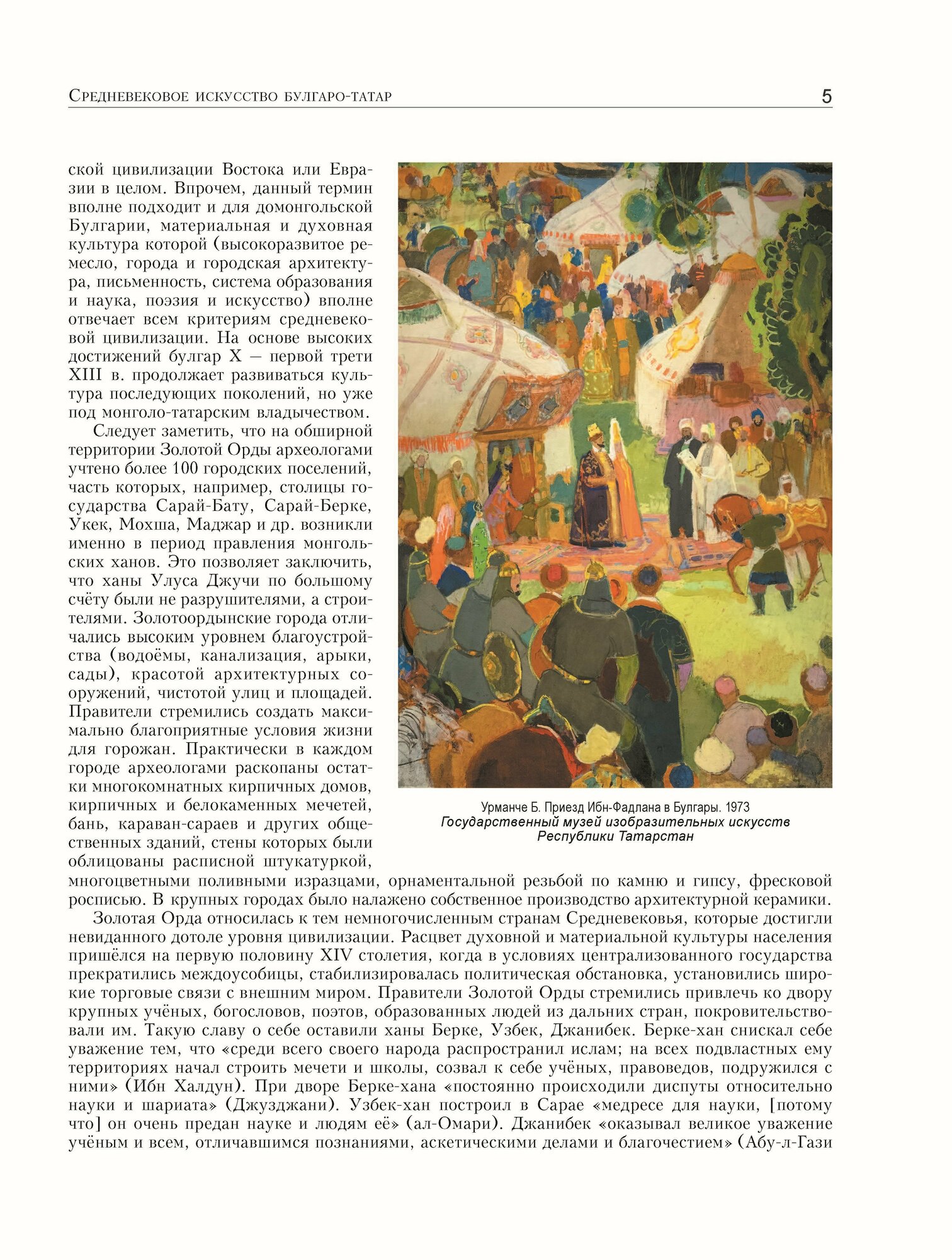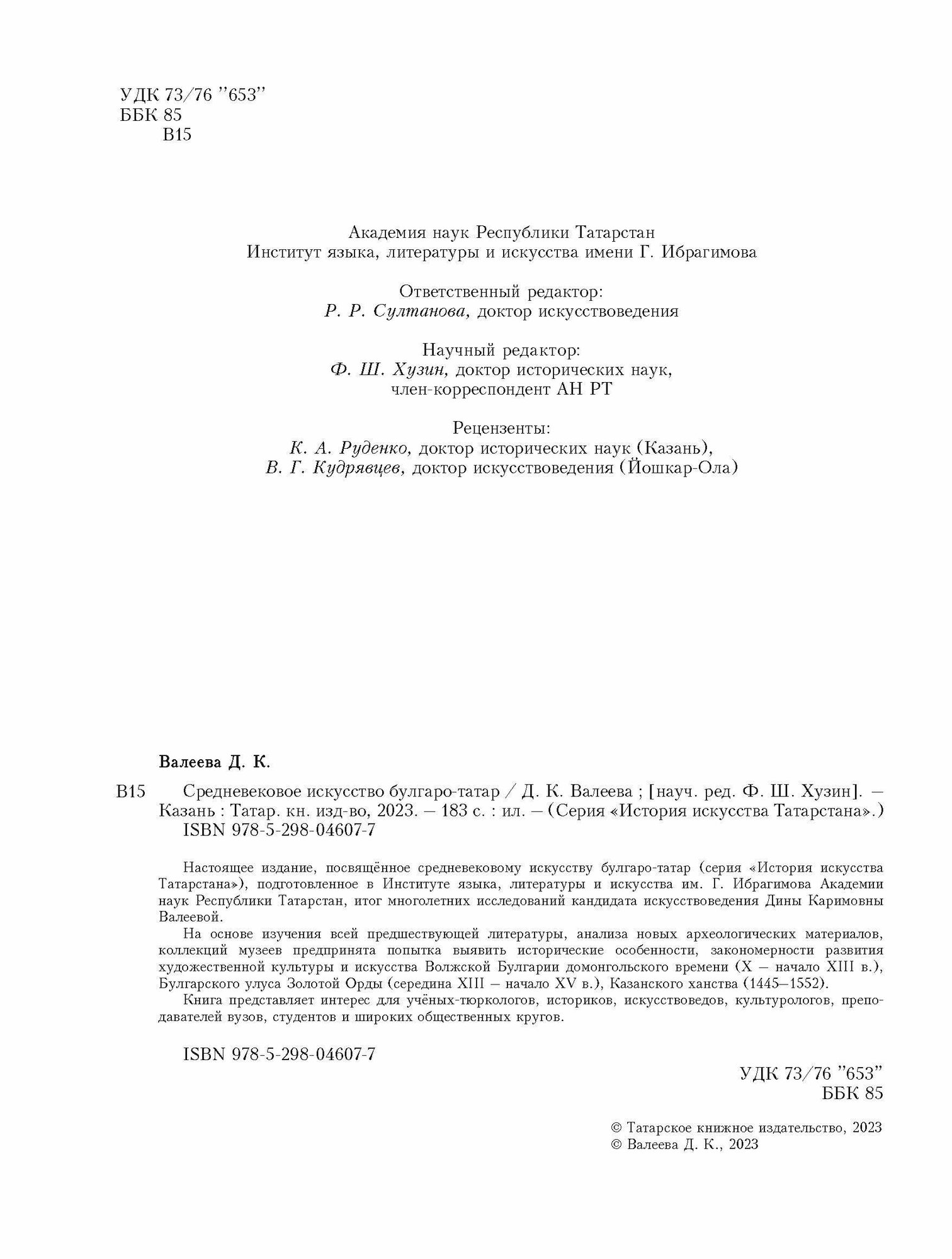 Настоящее издание, посвященное средневековому искусству булгаро-татар (серия «История искусства Татарстана»), подготовленное в Институте языка, литературы и искусства им. Г. Ибрагимова Академии наук Республики Татарстан, итог многолетних исследований кандидата искусствоведения Дины Каримовны Валеевой. На основе изучения всей предшествующей литературы, анализа новых археологических материалов, коллекций музеев предпринята попытка выявить исторические особенности, закономерности развития художественной культуры и искусства Волжской Булгарии домонгольского времени (Х - начало ХIII в.), Булгарского улуса Золотой Орды (середина ХIII - начало XV в.), Казанского ханства (1445-1552). Книга представляет интерес для ученых-тюркологов, историков, искусствоведов, культурологов, преподавателей вузов, студентов и широких общественных кругов.