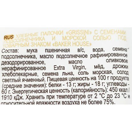 | Состав | мука пшеничная в/с, вода, семена подсолнечника, масло подсолнечное рафинированное дезодорированное, масло оливковое нерафинированное Extra Virgin, мёд, дрожжи хлебопекарные, семена льна, соль морская, солод светлый ячменный |