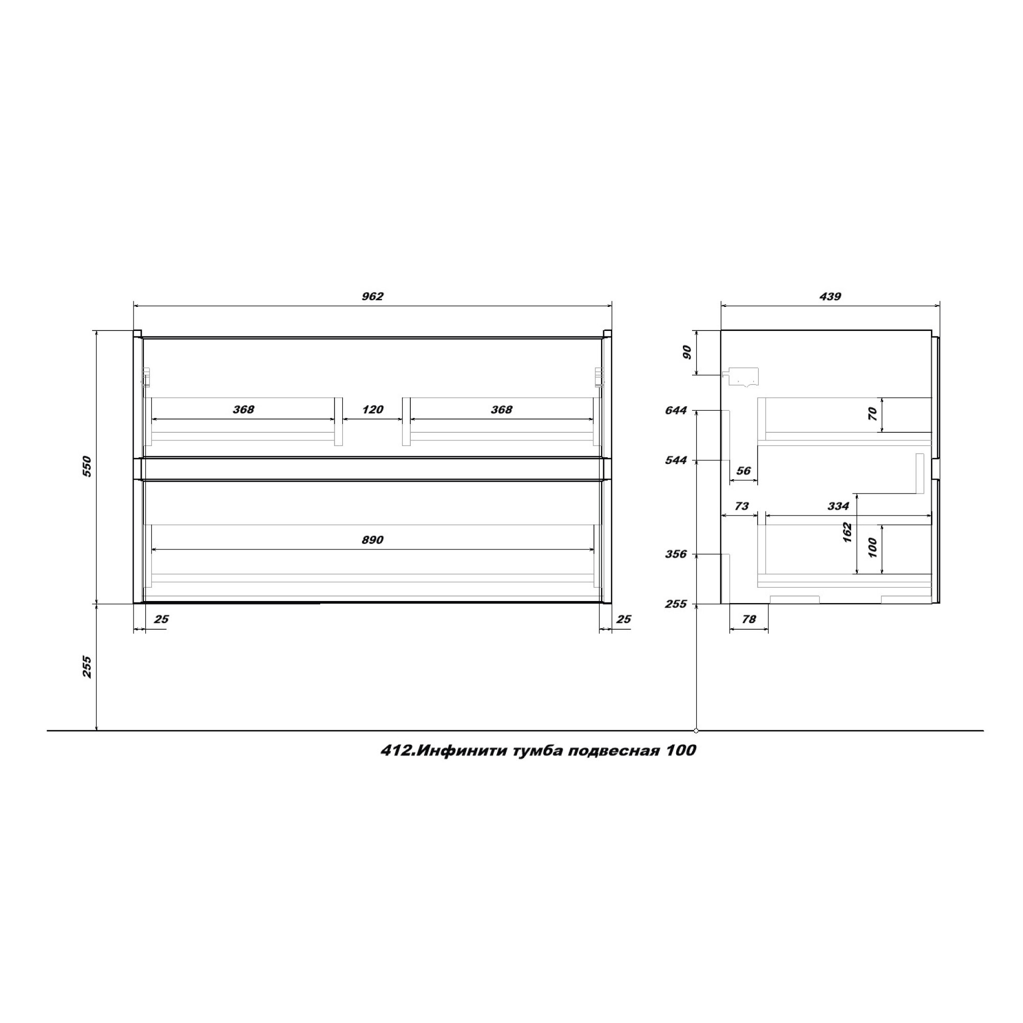 - Габариты корпуса тумбы (ШхВхГ): 962х550х439 мм.