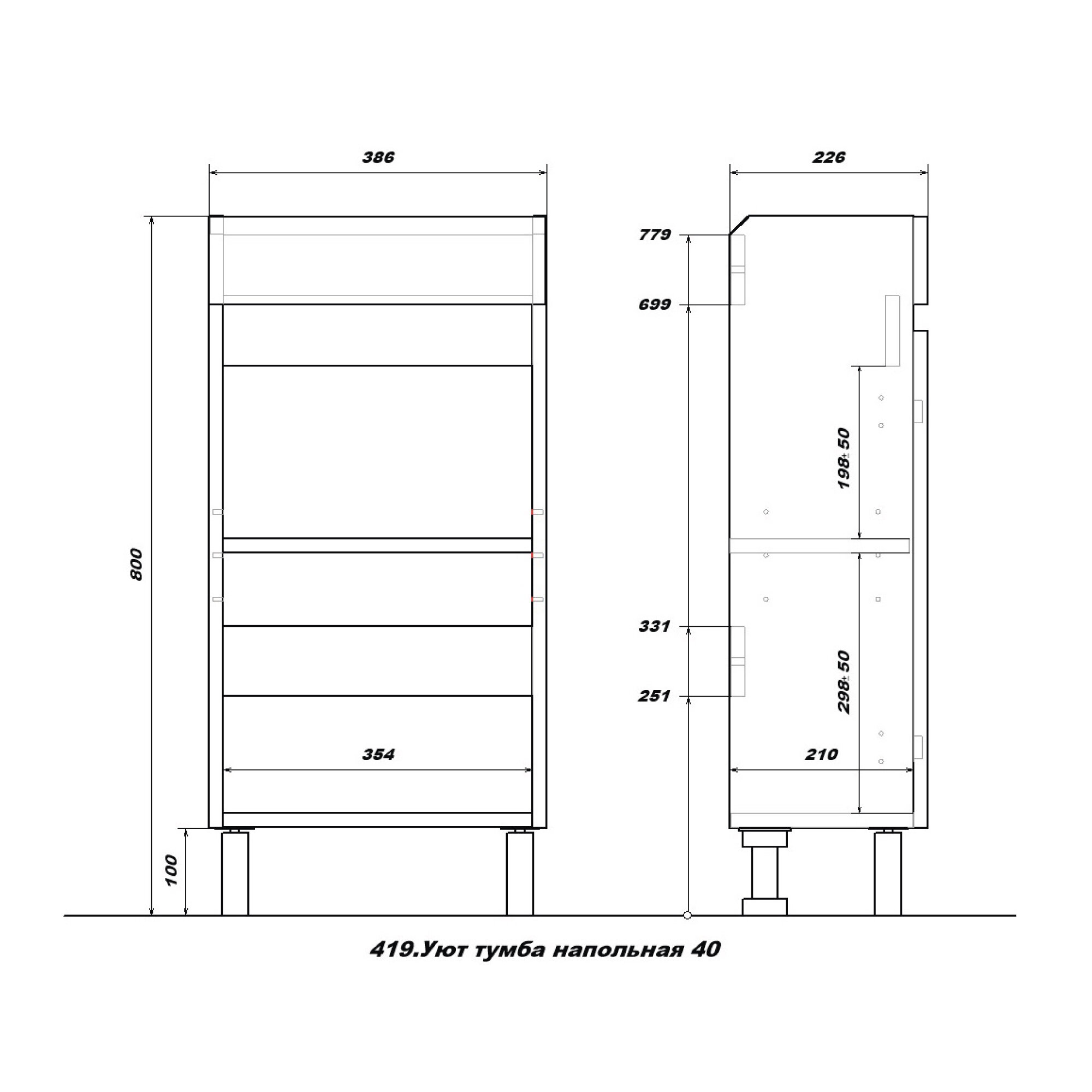 - Габариты корпуса тумбы (ШхВхГ): 386х800х226 мм.